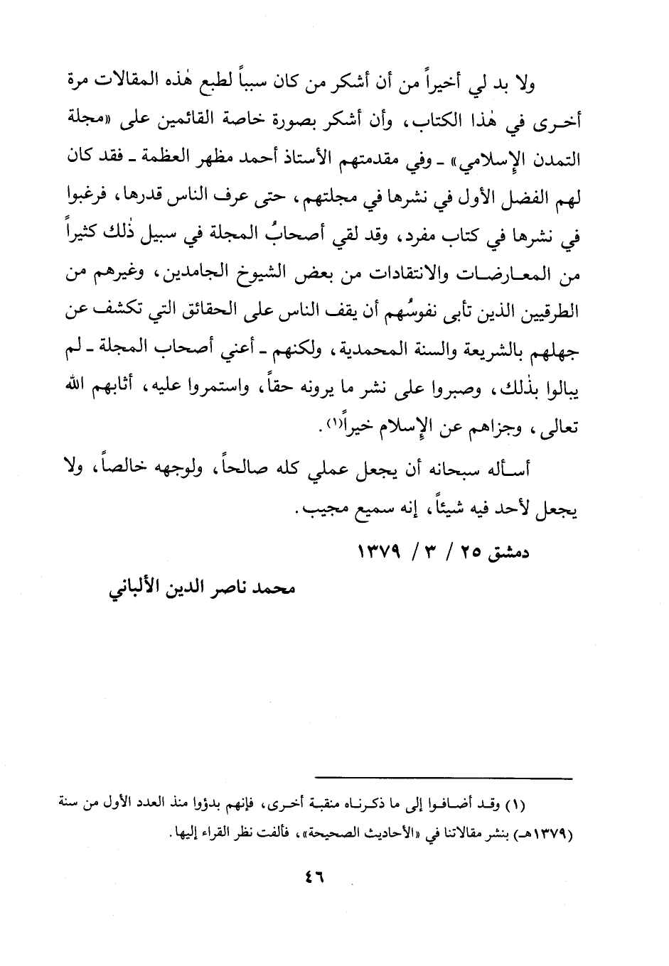 (1) وقد أضافوا إلى ما ذكرناه منقبة أخرى، فإنهم بدؤوا منذ العدد الأول من سنة (1379 هـ) بنشر مقالاتنا في "الأحاديث الصحيحة"، فألفت نظر القراء إليها.