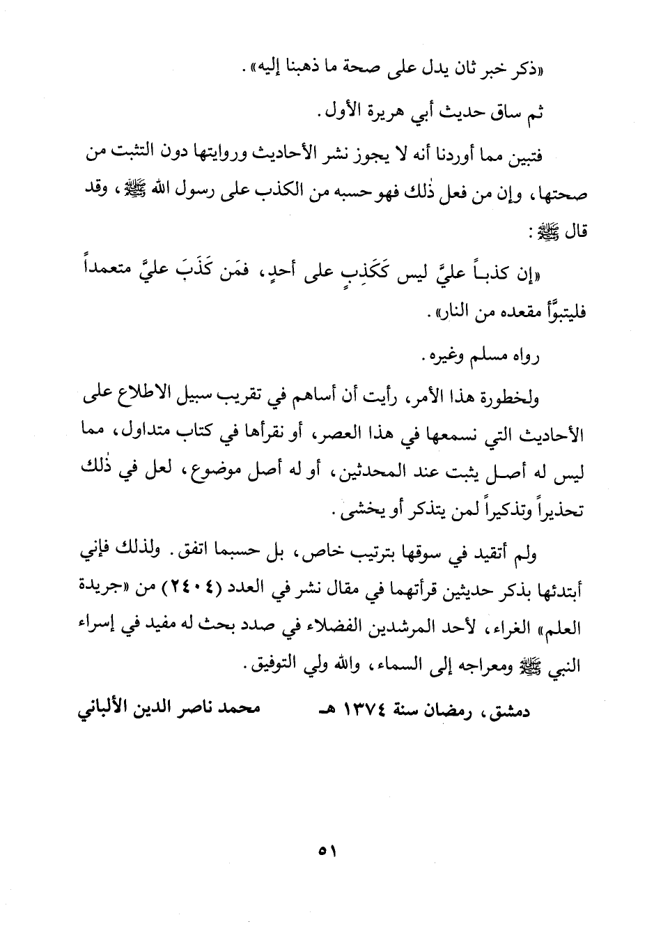 "إن كذباً على ليس كَكَذِبٍ على أحدٍ، فمَن كَذَبَ عليَّ متعمداً فليتبوَّأ مقعده من النار".