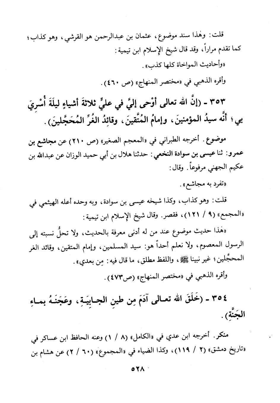 قلت: وهذا سند موضوع، عثمان بن عبد الرحمن هو القرشي وهو كذاب كما تقدم مرارا، وقد قال شيخ الإسلام ابن تيمية: وأحاديث المواخاة كلها كذب، وأقره الذهبي في " مختصر المنهاج " (ص 460) .
