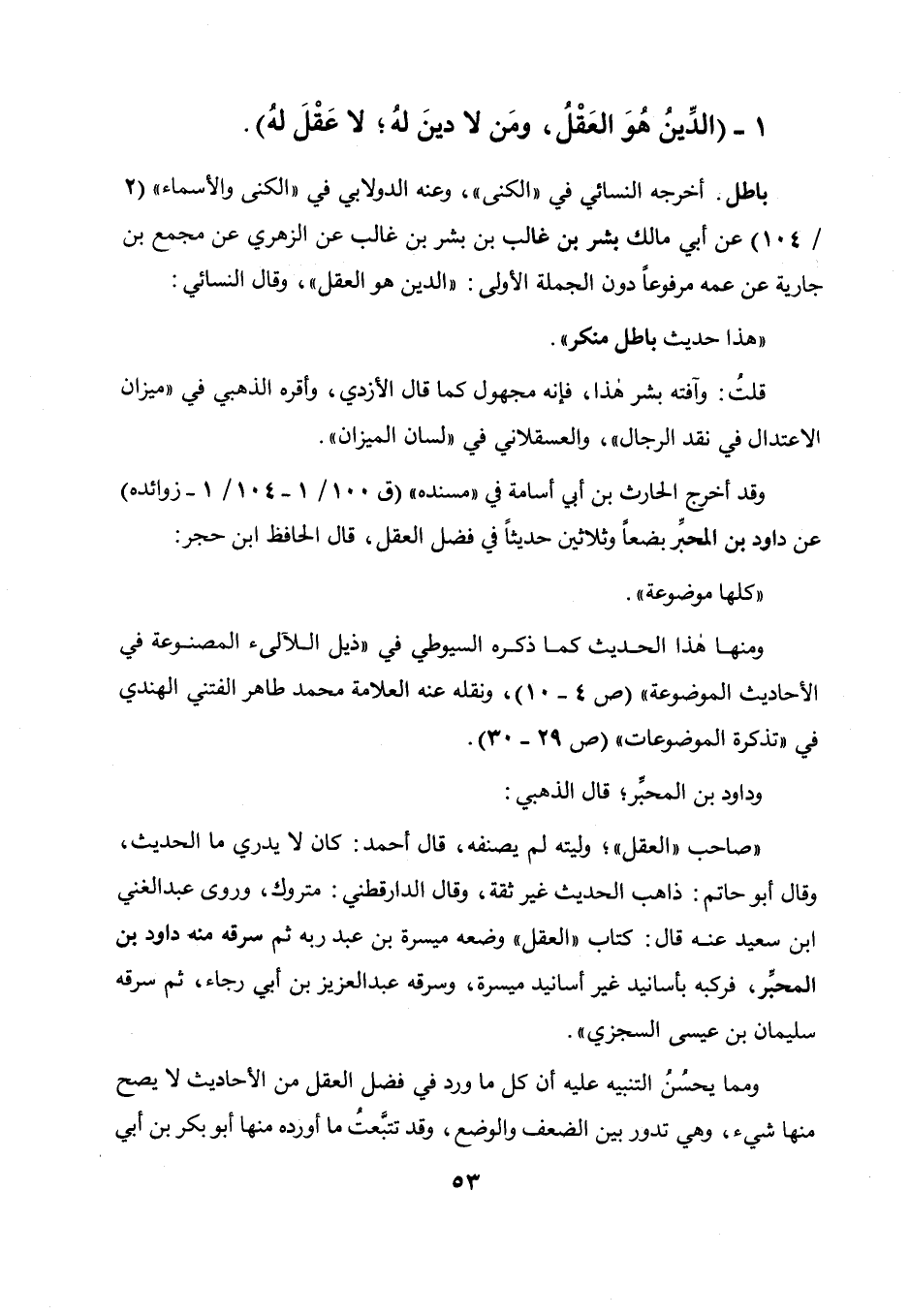 ومما يحسن التنبيه عليه أن كل ما ورد في فضل العقل من الأحاديث لا يصح منها شيء، وهي تدور بين الضعف والوضع، وقد تتبعت ما أورده منها أبو بكر بن أبي