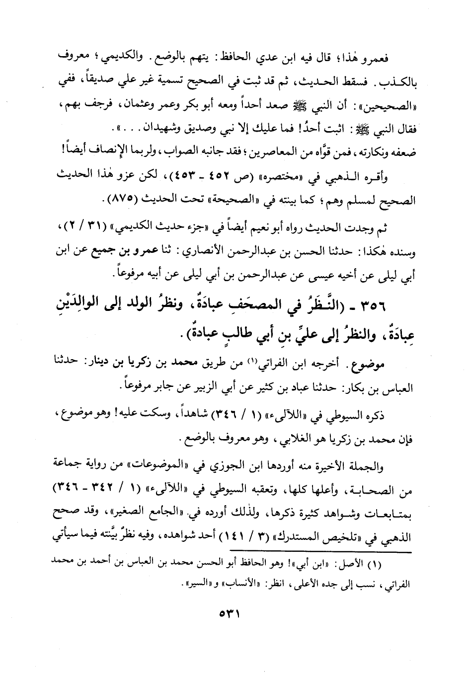 356 - " النظر فى المصحف عبادة، ونظر الولد إلى الوالدين عبادة، والنظر إلى علي بن أبي طالب عبادة ".