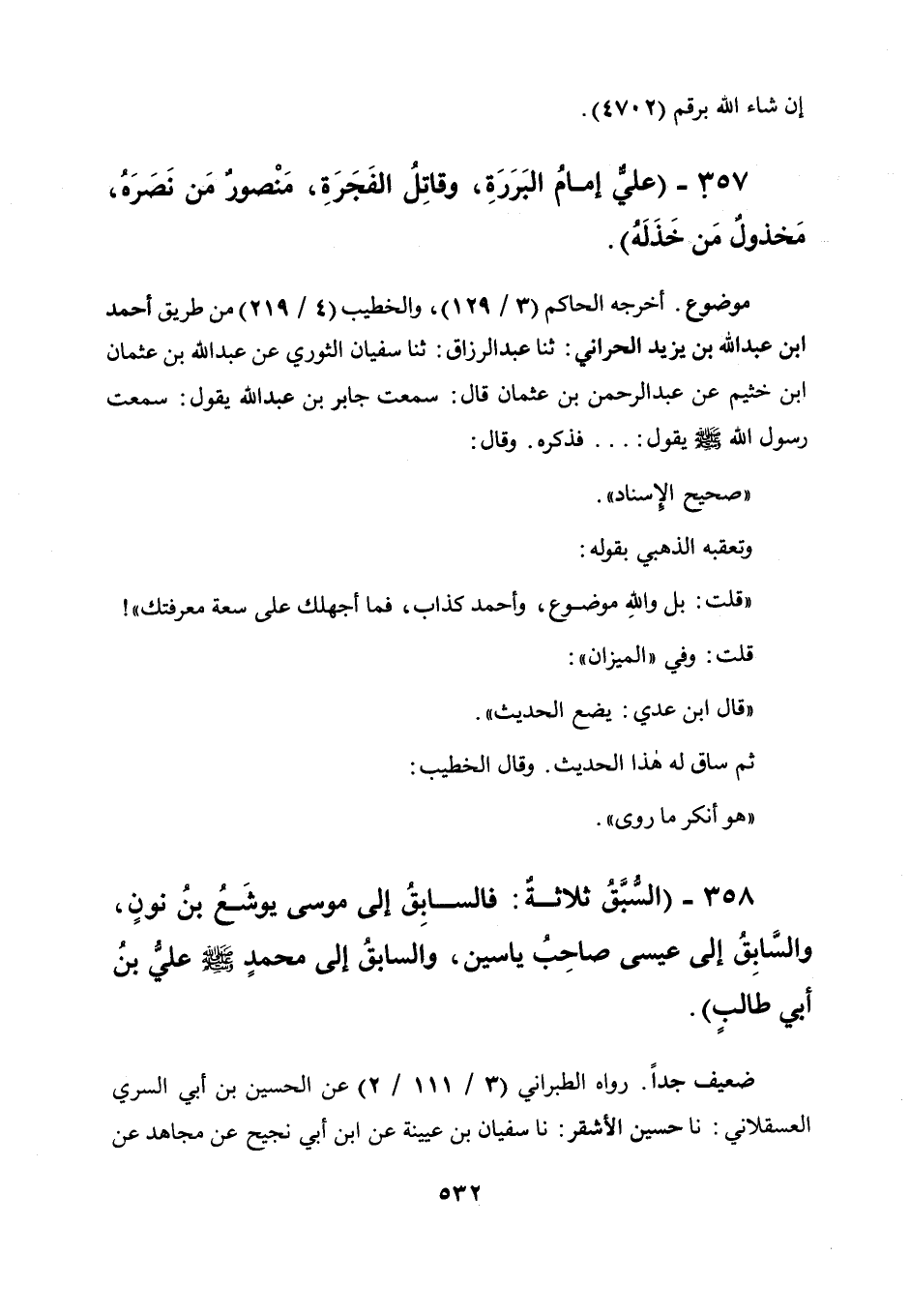 357 - " علي إمام البررة، وقاتل الفجرة، منصور من نصره، مخذول من خذله ".