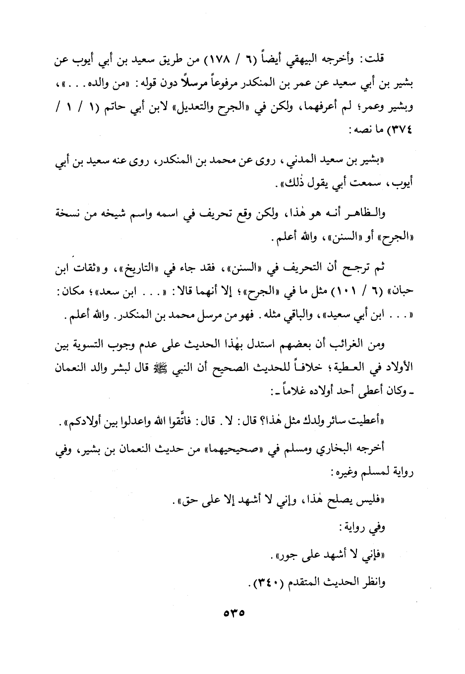 ومن الغرائب أن بعضهم استدل بهذا الحديث على عدم وجوب التسوية بين الأولاد في العطية، خلافا للحديث الصحيح أن النبي صلى الله عليه وسلم قال لبشر والد النعمان - وكان أعطى أحد أولاده غلاما -: " أعطيت سائر ولدك مثل هذا؟ قال: لا، قال: " فاتقوا الله واعدلوا بين أولادكم " أخرجه البخاري ومسلم في " صحيحيهما " من حديث النعمان بن بشير، وفي رواية لمسلم وغيره: " فليس يصلح هذا، وإني لا أشهد إلا على حق " وفي رواية: " فإني لا أشهد على جور ". وانظر الحديث المتقدم (340) .