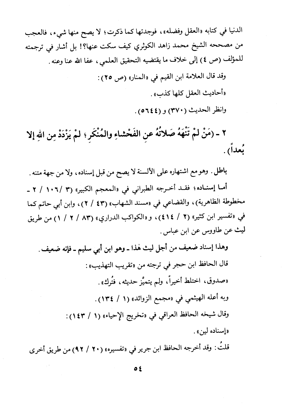الدنيا في كتابه " العقل وفضله " فوجدتها كما ذكرت لا يصح منها شيء، فالعجب من مصححه الشيخ محمد زاهد الكوثري كيف سكت عنها؟ ! بل أشار في ترجمته للمؤلف (ص 4) إلى خلاف ما يقتضيه التحقيق العلمي عفا الله عنا وعنه.