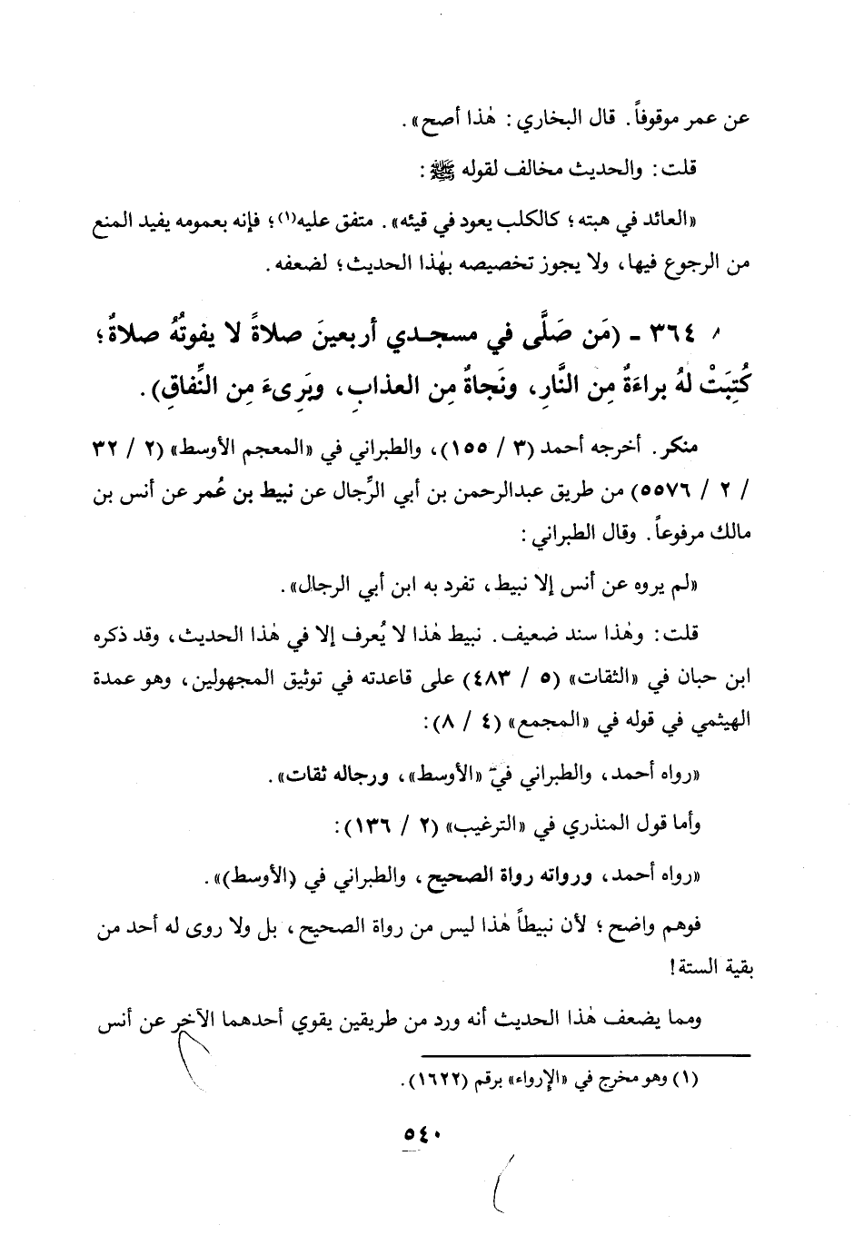 364 - " من صلى فى مسجدي أربعين صلاة لا يفوته صلاة كتبت له براءة من النار، ونجاة من العذاب، وبرئ من النفاق ".