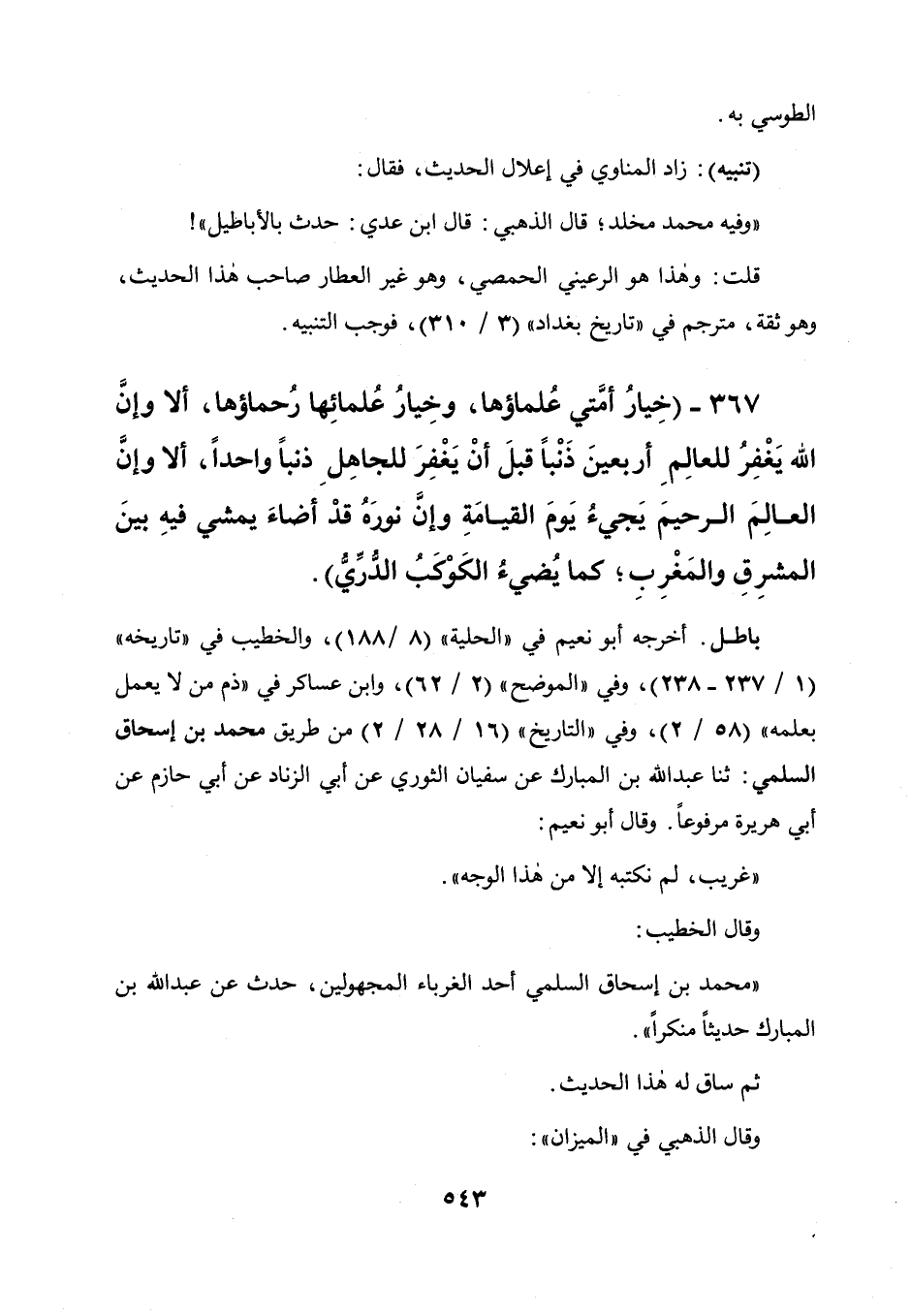 367 - " خيار أمتي علماؤها، وخيار علمائها رحماؤها، ألا وإن الله يغفر للعالم أربعين ذنبا، قبل أن يغفر للجاهل ذنبا واحدا، ألا وإن العالم الرحيم يجيء يوم القيامة وإن نوره قد أضاء يمشي فيه بين المشرق والمغرب كما يضيء الكوكب الدري ".