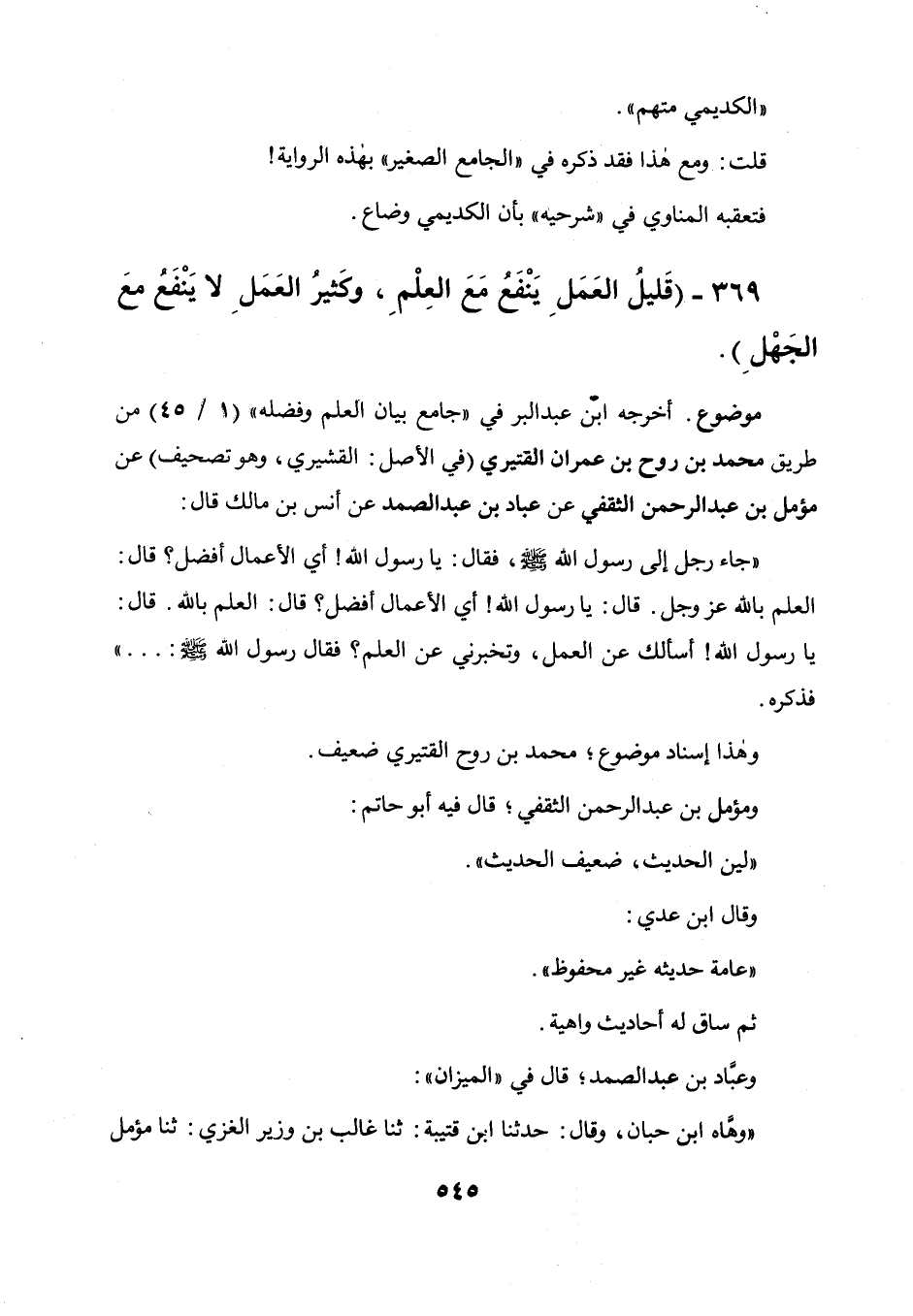 أخرجه ابن عبد البر في " جامع بيان العلم وفضله " (1 / 45) من طريق محمد بن روح بن عمران القتيرى في الأصل: القشيري وهو تصحيف عن مؤمل بن عبد الرحمن الثقفي عن عباد بن عبد الصمد عن أنس بن مالك قال: