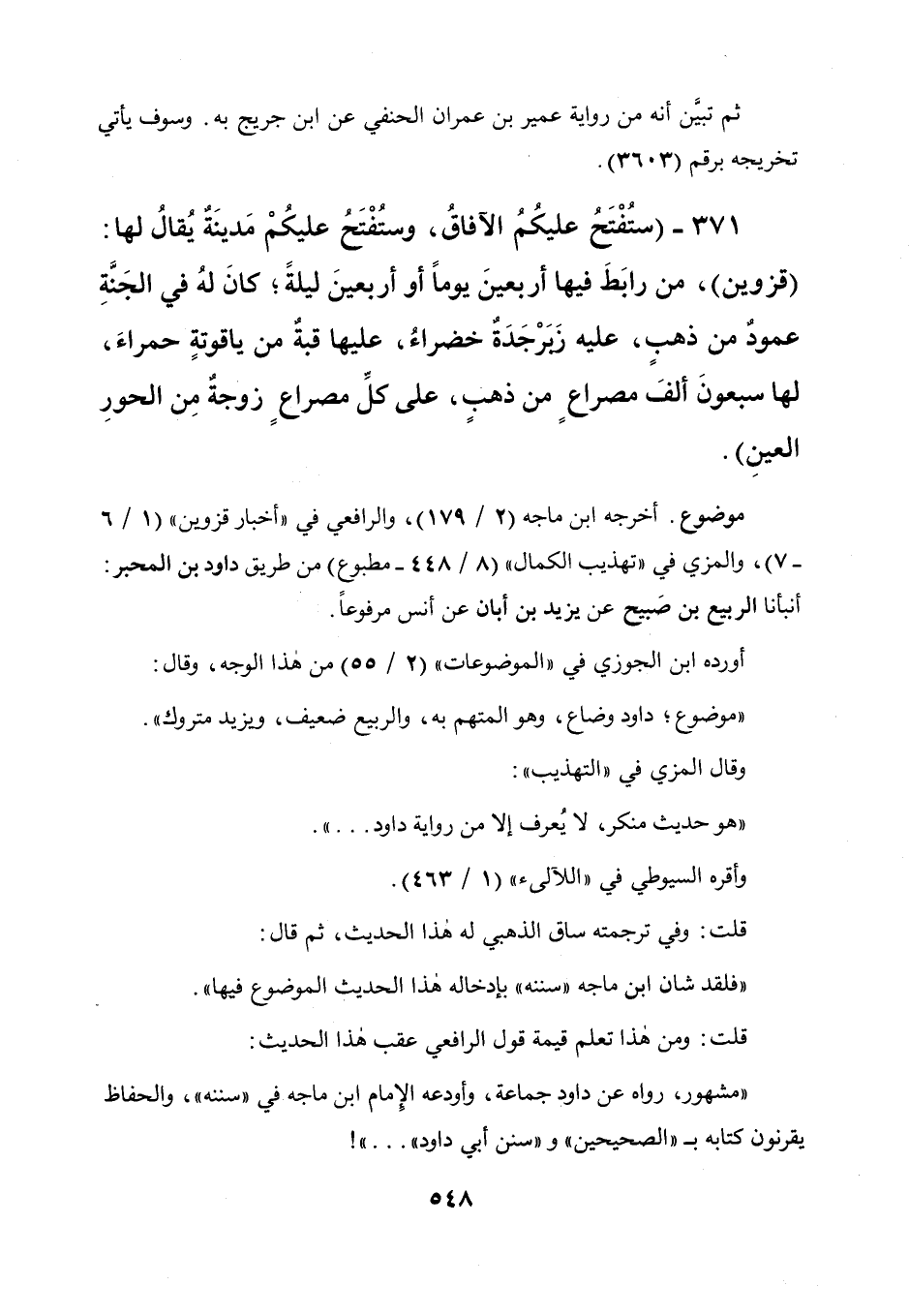 371 - " ستفتح عليكم الآفاق، وستفتح عليكم مدينة يقال لها: قزوين، من رابط فيها أربعين يوما أو أربعين ليلة، كان له فى الجنة عمود من ذهب عليه زبرجدة خضراء، عليها قبة من ياقوتة حمراء، لها سبعون ألف مصراع من ذهب، على كل مصراع زوجة من الحور العين ".