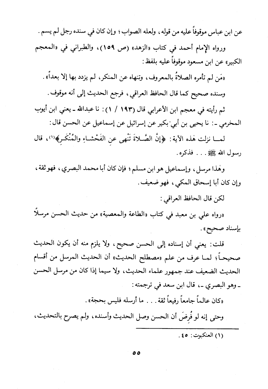 وسنده صحيح كما قال الحافظ العراقي، فرجع الحديث إلى أنه موقوف، ثم رأيته في معجم ابن الأعرابي قال (193 / 1) ، أنبأنا عبد الله - يعني ابن أيوب المخرمي - أنبأنا يحيى بن أبي بكير عن إسرائيل عن إسماعيل عن الحسن قال: لما نزلت هذه الآية {إن الصلاة تنهى عن الفحشاء والمنكر} (العنكبوت: 45) قال رسول الله صلى الله عليه وسلم ... فذكره.