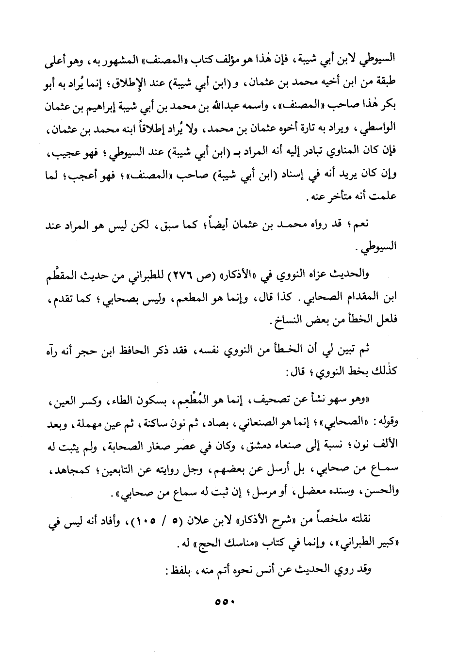 السيوطي لابن أبي شيبة، فإن هذا هو مؤلف كتاب " المصنف " المشهور به، وهو أعلى طبقة من ابن أخيه محمد بن عثمان، وابن أبي شيبة عند الإطلاق، إنما يراد به أبو بكر هذا صاحب " المصنف " واسمه عبد الله بن محمد بن أبي شيبة: إبراهيم بن عثمان الواسطي ويراد به تارة أخوه عثمان بن محمد، ولا يراد إطلاقا ابنه محمد بن عثمان، فإن كان المناوي تبادر إليه أنه المراد بـ ابن أبي شيبة عند السيوطي فهو عجيب، وإن كان يريد أنه في إسناد ابن أبي شيبة صاحب " المصنف " فهو أعجب، لما علمت أنه متأخر عنه.