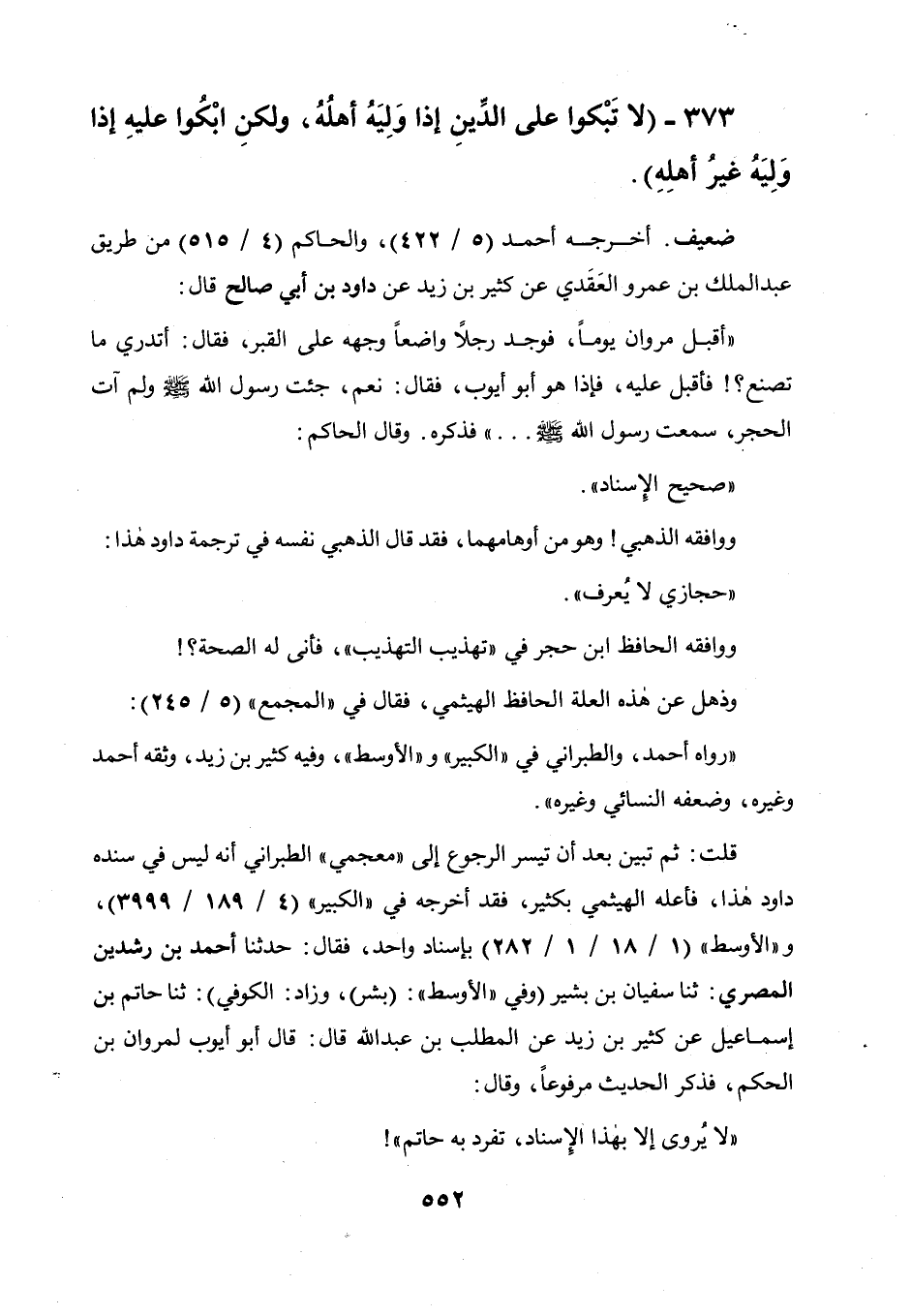 قلت: ثم تبين بعد أن تيسر الرجوع إلى معجمي الطبراني أنه ليس في سنده داود هذا، فأعله الهيثمي بكثير، فقد أخرجه في " الكبير " (4 / 189 / 3999) ، و" الأوسط " (1 / 18 / 1 / 282) بإسناد واحد، فقال: حدثنا أحمد بن رشدين المصري: حدثنا سفيان بن بشير وفي " الأوسط ": بشر، وزاد: الكوفي: حدثنا حاتم بن إسماعيل عن كثير بن زيد عن المطلب بن عبد الله قال: قال أبو أيوب لمروان بن الحكم، فذكر الحديث مرفوعا، وقال: لا يروى إلا بهذا الإسناد، تفرد به حاتم!
