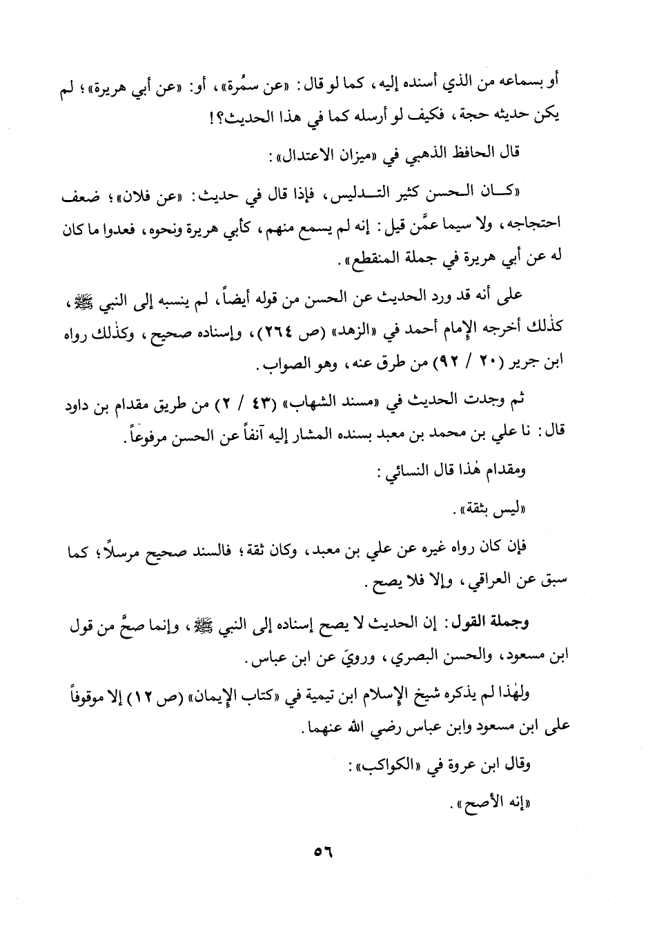 أو بسماعه من الذي أسنده إليه كما لوقال: عن سمرة أو عن أبي هريرة لم يكن حديثه حجة، فكيف لوأرسله كما في هذا الحديث؟ ! قال الحافظ الذهبي في " ميزان الاعتدال ": كان الحسن كثير التدليس، فإذا قال في حديث عن فلان ضعف احتجاجه ولا سيما عمن قيل: إنه لم يسمع منهم كأبي هريرة ونحوه، فعدوا ما كان له عن أبي هريرة في