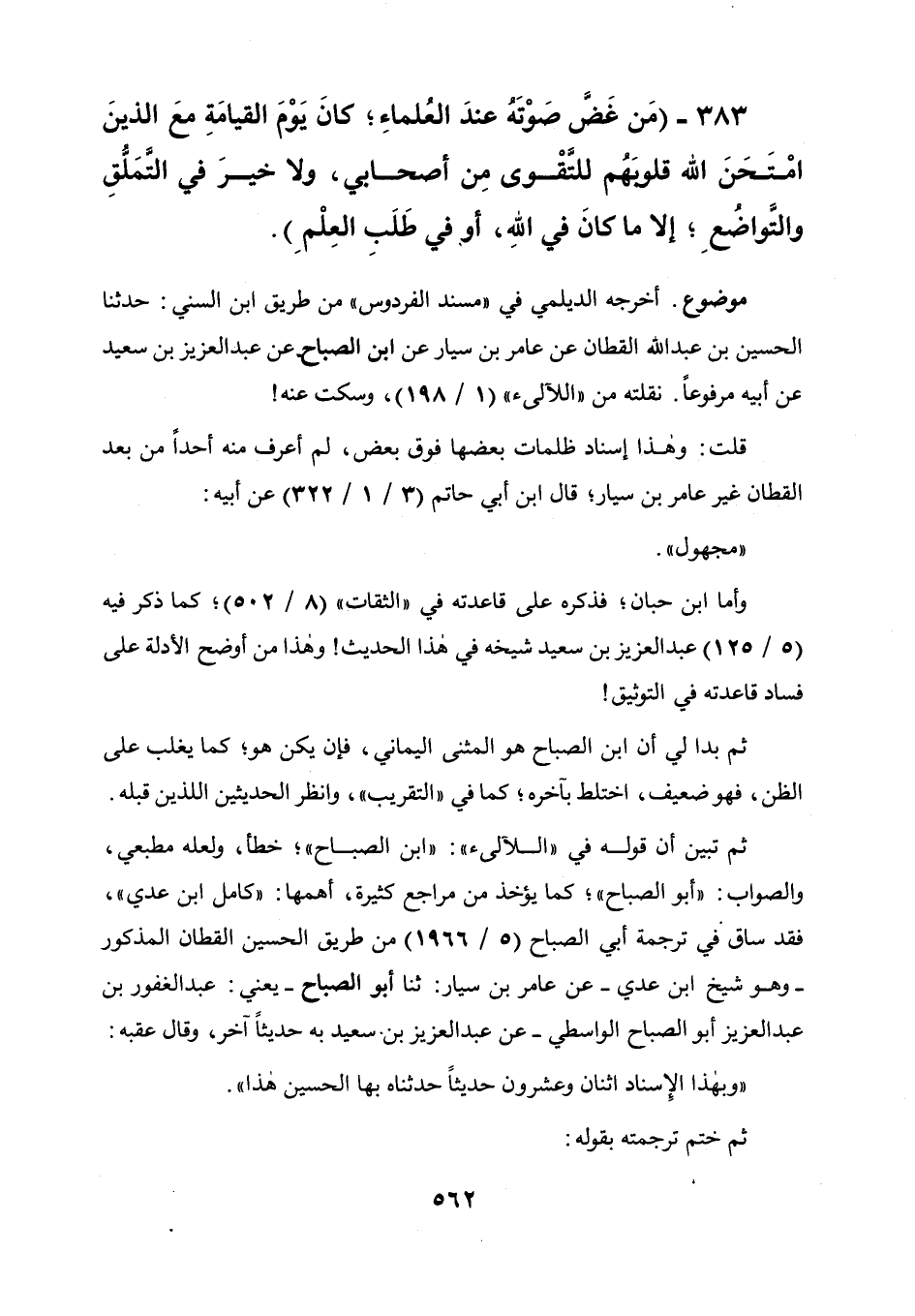 ثم تبين أن قوله في " اللآليء ": ابن الصباح خطأ ولعله مطبعي والصواب أبو الصباح كما يؤخذ من مراجع كثيرة أهمها " كامل ابن عدي " فقد ساق في ترجمة أبي الصباح (5 / 1966) من طريق الحسين القطان المذكور وهو شيخ ابن عدي عن عامر بن سيار حدثنا أبو الصباح يعني عبد الغفور بن عبد العزيز أبو الصباح الواسطي عن عبد العزيز بن سعيد به حديثا آخر وقال عقبه: وبهذا الإسناد اثنان وعشرون حديثا حدثناه بها الحسين هذا، ثم ختم ترجمته بقوله: