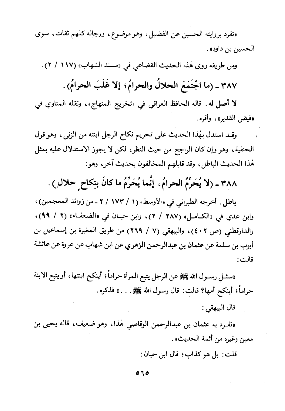 قاله الحافظ العراقي في " تخريج المنهاج " ونقله المناوي في " فيض القدير " وأقره، وقد استدل بهذا الحديث على تحريم نكاح الرجل ابنته من الزنى، وهو قول الحنفية وهو وإن كان الراجح من حيث النظر، لكن لا يجوز الاستدلال عليه بمثل هذا الحديث الباطل، وقد قابلهم المخالفون بحديث آخر وهو: