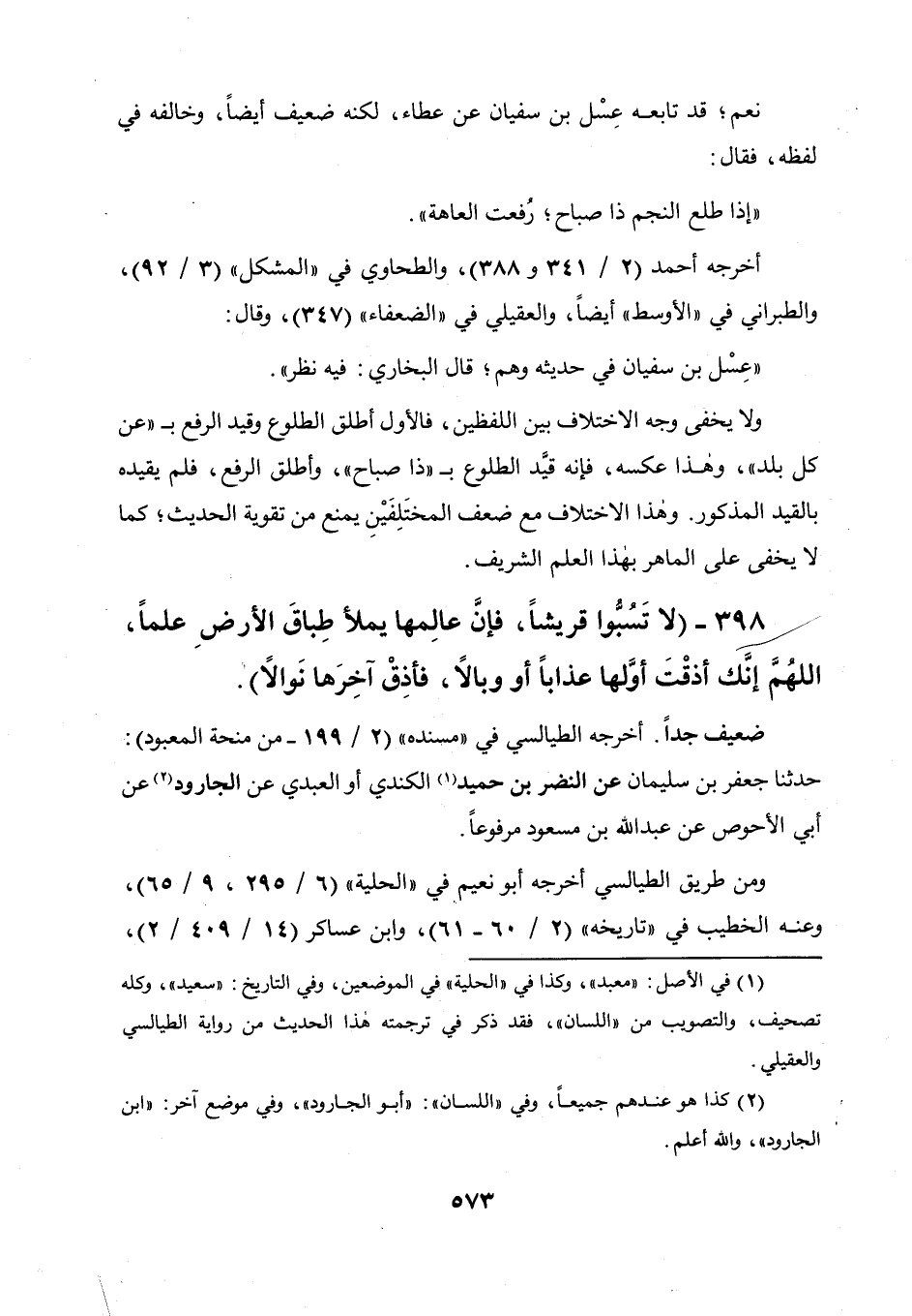 ولا يخفى وجه الاختلاف بين اللفظين، فالأول أطلق الطلوع وقيد الرفع بـ عن كل بلد، وهذا عكسه فإنه قيد الطلوع بـ ذا صباح، وأطلق الرفع فلم يقيده بالقيد المذكور، وهذا الاختلاف مع ضعف المختلفين يمنع من تقوية الحديث كما لا يخفى على الماهر بهذا العلم الشريف.