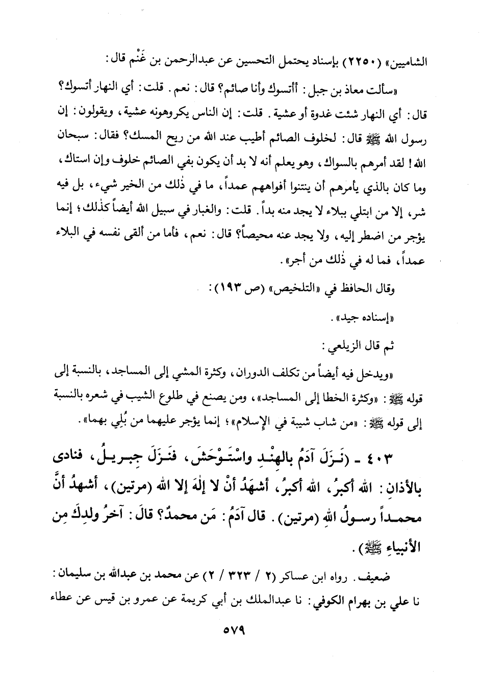 403 - " نزل آدم الهند واستوحش، فنزل جبريل فنادى بالأذان الله أكبر الله أكبر، أشهد أن لا إله إلا الله، مرتين، أشهد أن محمدا رسول الله مرتين، قال آدم: من محمد؟ قال: آخر ولدك من الأنبياء صلى الله عليه وسلم ".