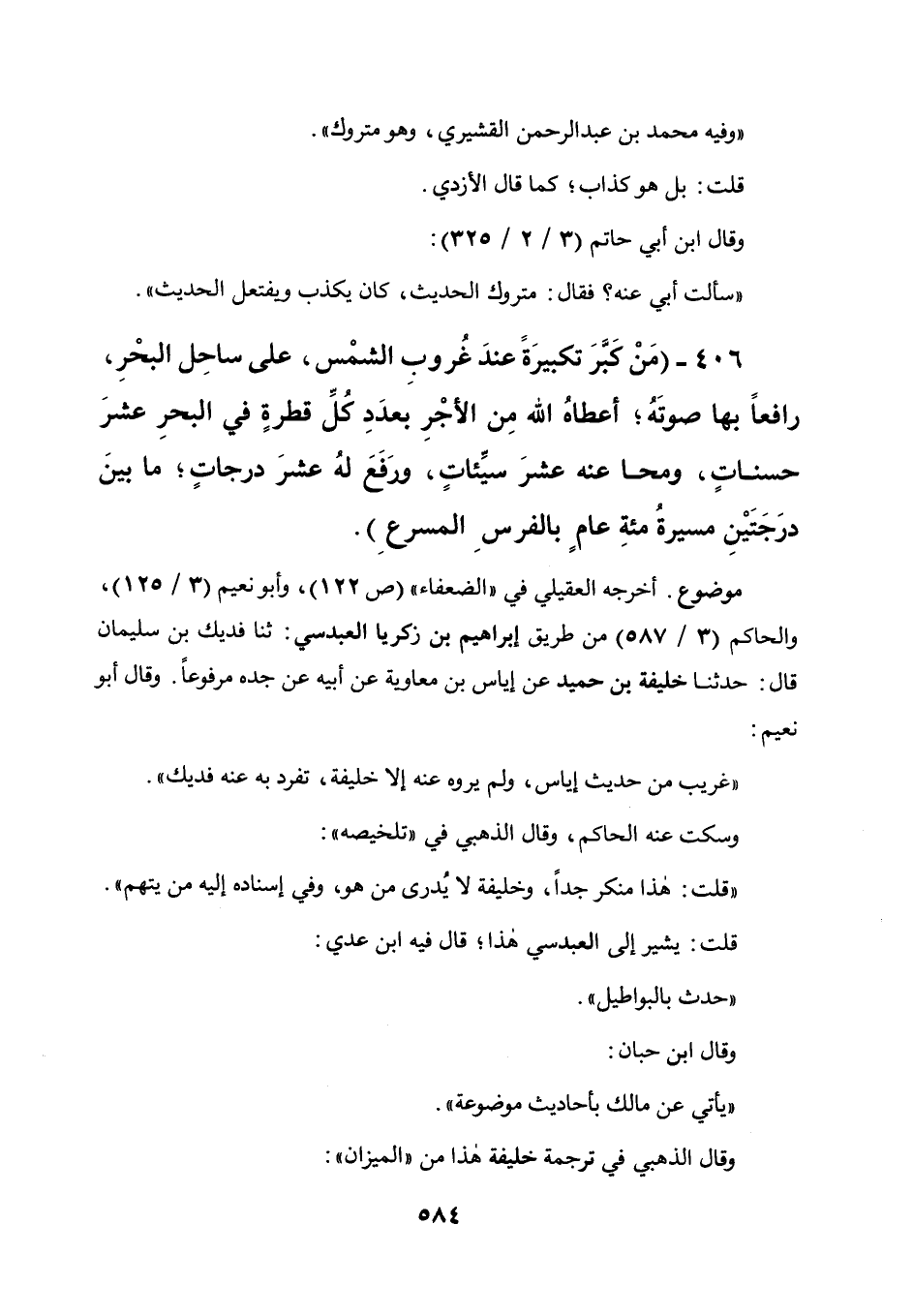 406 - " من كبر تكبيرة عند غروب الشمس على ساحل البحر رافعا بها صوته أعطاه الله من الأجر بعدد كل قطرة فى البحر عشر حسنات، ومحا عنه عشر سيئات، ورفع له عشر درجات ما بين درجتين مسيرة مائة عام بالفرس المسرع ".