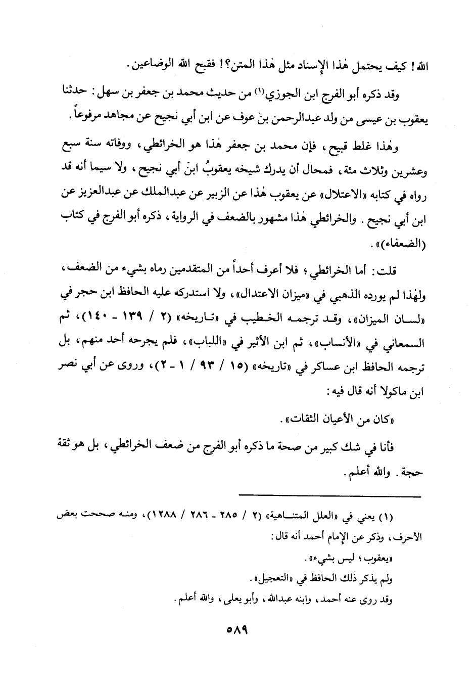 فأنا في شك كبير من صحة ما ذكره أبو الفرج من ضعف الخرائطي، بل هو ثقة حجة. والله أعلم.