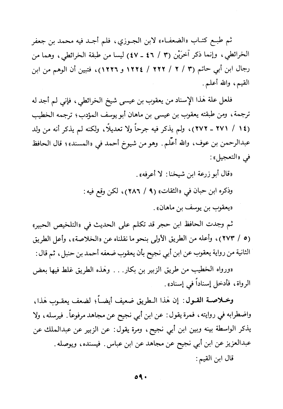 وأعله من الطريق الأولى بنحو ما نقلناه عن " الخلاصة " وأعل الطريق الثانية من رواية يعقوب عن ابن أبي نجيح بأن يعقوب ضعفه أحمد بن حنبل، ثم قال: