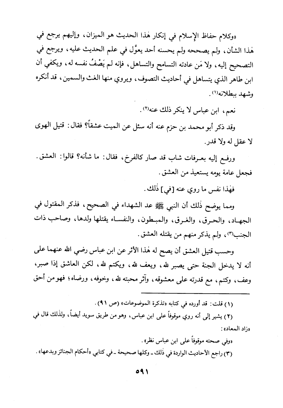 ومما يوضح ذلك أن النبي صلى الله عليه وسلم عد الشهداء في الصحيح، فذكر المقتول في الجهاد والحرق والغرق، والمبطون، والنفساء يقتلها ولدها، وصاحب ذات الجنب، ولم يذكر منهم من يقتله العشق، وحسب قتيل العشق أن يصح له هذا الأثر عن ابن عباس رضي الله عنهما على أنه لا يدخل الجنة حتى يصبر لله، ويعف لله ويكتم لله، لكن العاشق إذا صبر وعف وكتم مع قدرته على معشوقه وآثر محبته لله وخوفه ورضاه فهو من أحق