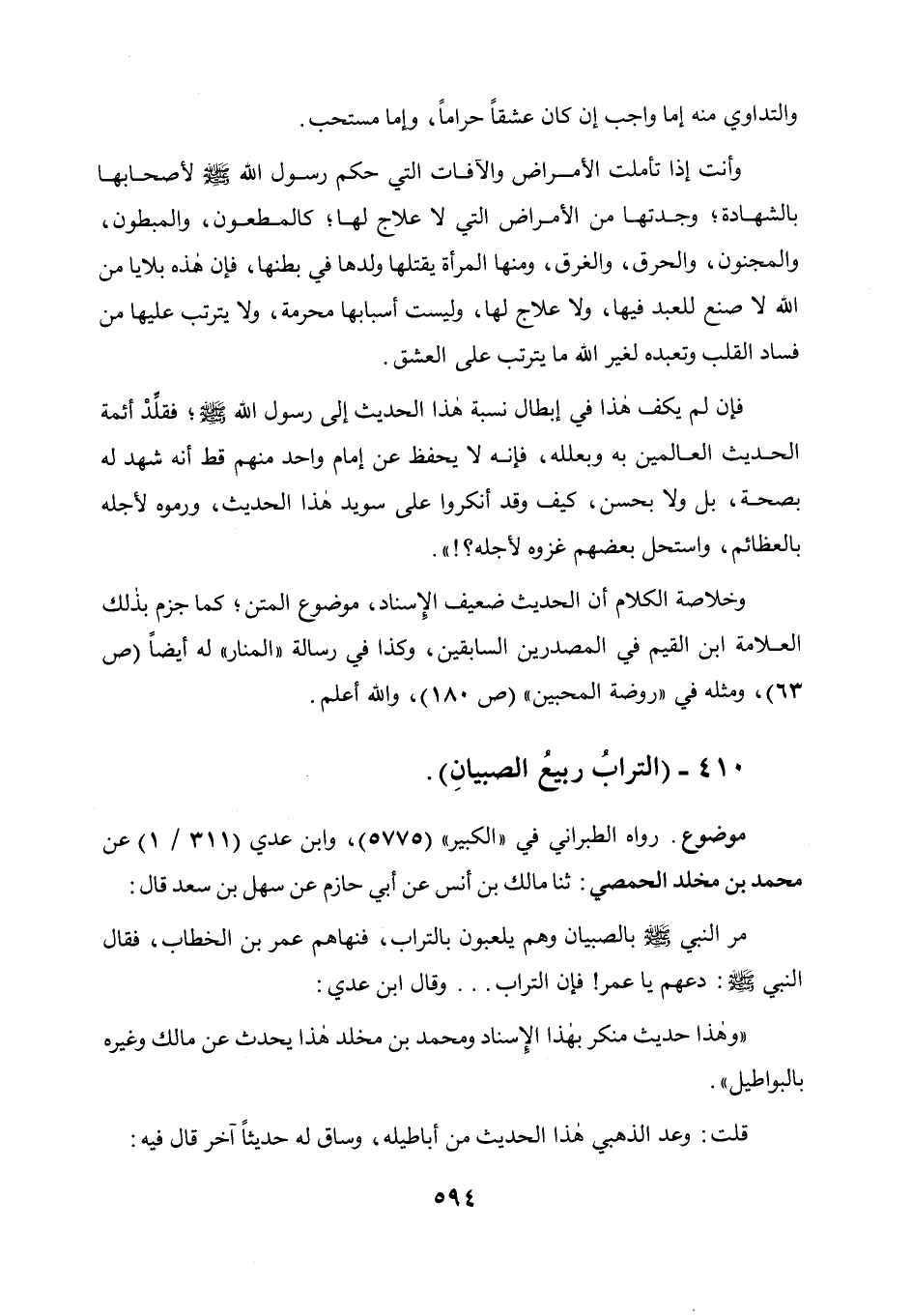 والتداوي منه إما واجب إن كان عشقا حراما، وإما مستحب، وأنت إذا تأملت الأمراض والآفات التي حكم رسول الله صلى الله عليه وسلم لأصحابها بالشهادة وجدتها من الأمراض التي لا علاج لها، كالمطعون والمبطون والمجنون والحرق والغرق، ومنها المرأة يقتلها ولدها في بطنها، فإن هذه بلايا من الله لا صنع للعبد فيها ولا علاج لها، وليست أسبابها محرمة ولا يترتب عليها من فساد القلب وتعبده لغير الله ما يترتب على العشق، فإن لم يكف هذا في إبطال نسبة هذا الحديث إلى رسول الله صلى الله عليه وسلم، فقلد أئمة الحديث العالمين به وبعلله فإنه لا يحفظ عن إمام واحد منهم قط أنه شهد له بصحة، بل ولا بحسن، كيف وقد أنكروا على سويد هذا الحديث ورموه لأجله بالعظائم واستحل بعضهم غزوه لأجله.