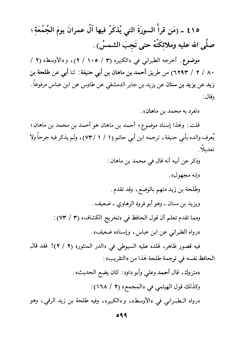 415 - " من قرأ السورة التي يذكر فيها آل عمران يوم الجمعة صلى الله عليه وملائكته حتى تجب الشمس ".