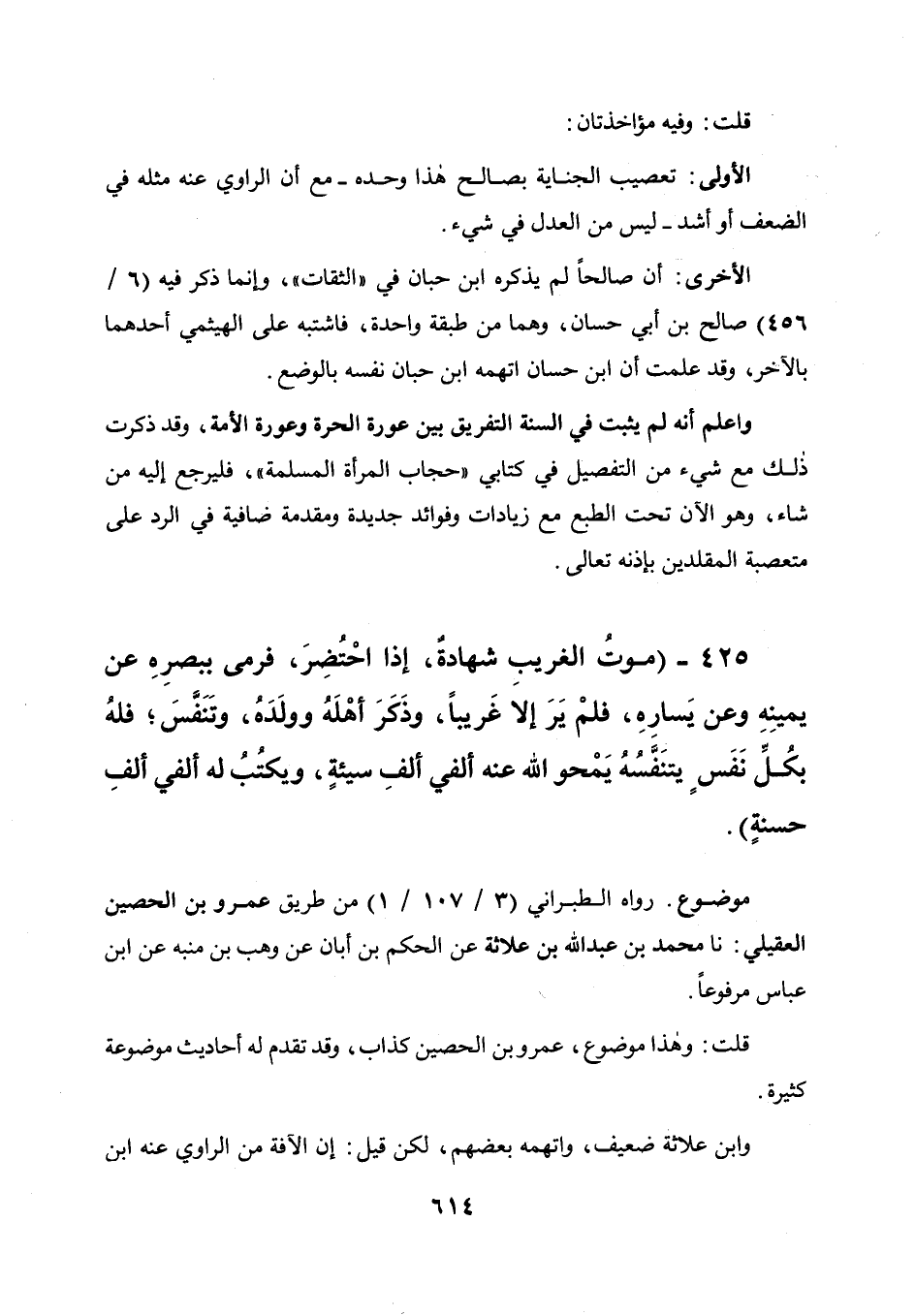 الأولى: تعصيب الجناية بصالح هذا وحده مع أن الراوي عنه مثله في الضعف أو أشد ليس من العدل في شيء.