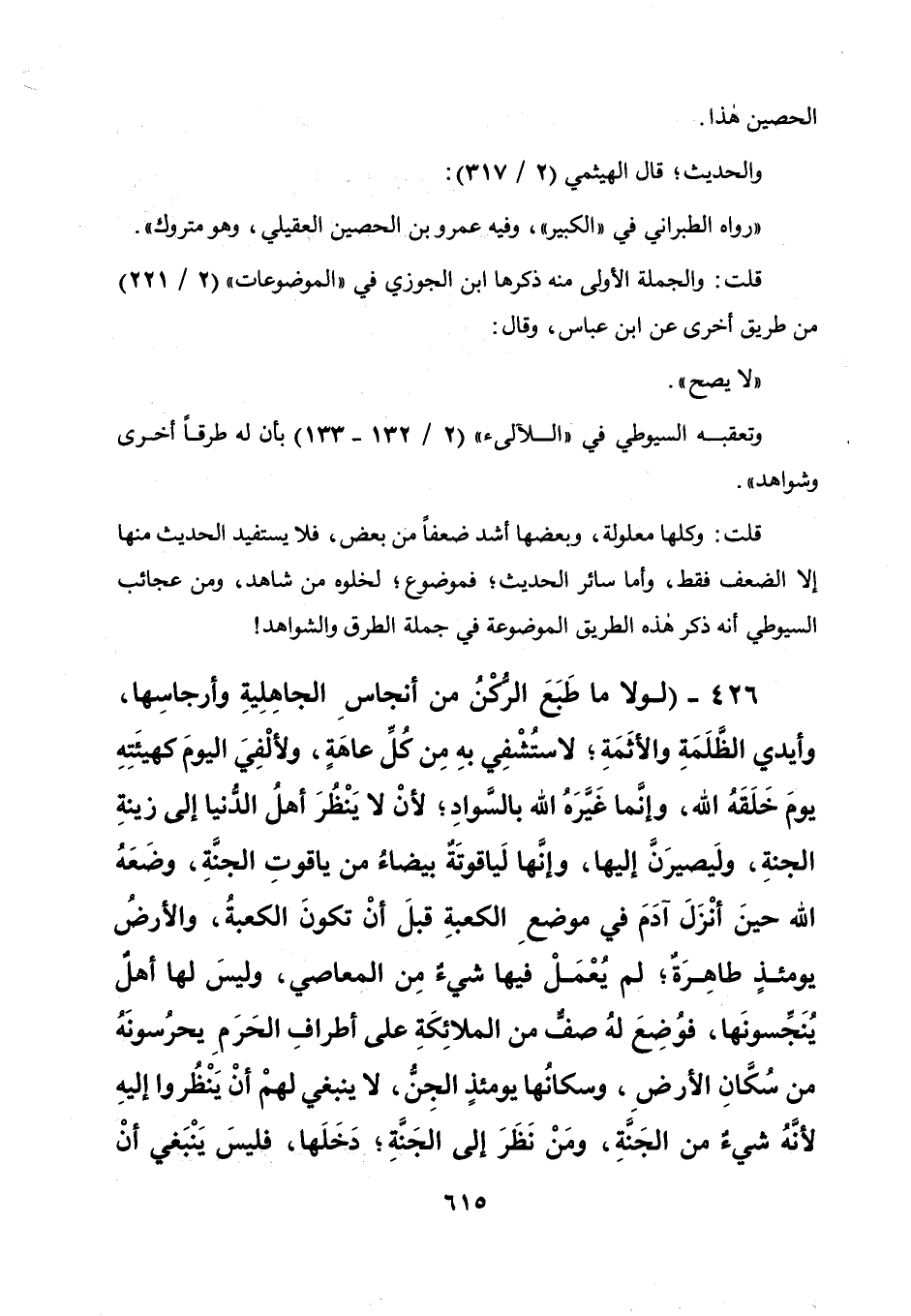 426 - " لولا ما طبع الركن من أنجاس الجاهلية وأرجاسها وأيدى الظلمة والأثمة، لاستشفي به من كل عاهة، ولألفي اليوم كهيئته يوم خلقه الله، وإنما غيره الله بالسواد لأن لا ينظر أهل الدنيا إلى زينة الجنة، وليصيرن إليها، وإنها لياقوتة بيضاء من ياقوت الجنة وضعه الله حين أنزل آدم فى موضع الكعبة قبل أن تكون الكعبة، والأرض يومئذ طاهرة لم يعمل فيها شيء من المعاصي، وليس لها أهل ينجسونها، فوضع له صف من الملائكة على أطراف الحرم يحرسونه من سكان الأرض، وسكانها يومئذ الجن، لا ينبغي لهم أن ينظروا إليه لأنه شيء من الجنة، ومن نظر إلى الجنة دخلها، فليس ينبغي أن