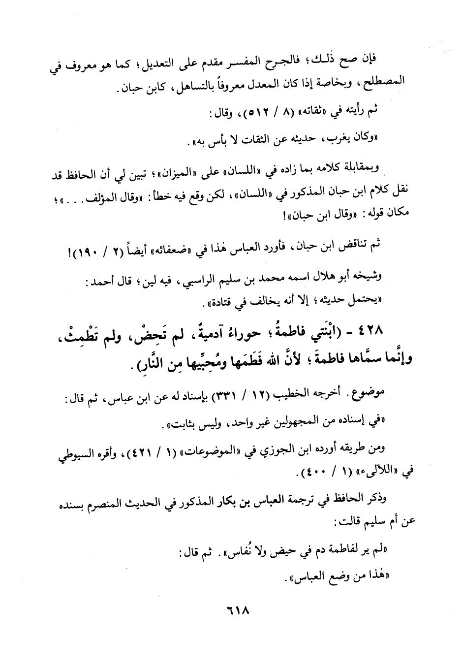 428 - " ابنتي فاطمة حوراء آدمية لم تحض ولم تطمث، وإنما سماها فاطمة، لأن الله فطمها ومحبيها من النار ".