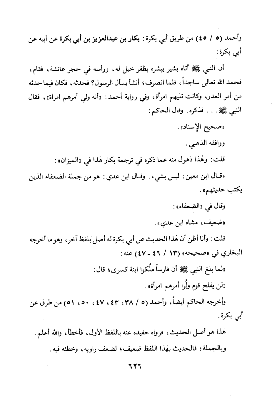 قلت: وأنا أظن أن هذا الحديث عن أبي بكرة له أصل بلفظ آخر، وهو ما أخرجه البخاري في " صحيحه " (13 / 46 - 47) عنه: لما بلغ النبي صلى الله عليه وسلم أن فارسا ملكوا ابنة كسرى قال: " لن يفلح قوم ولوا أمرهم امرأة ".