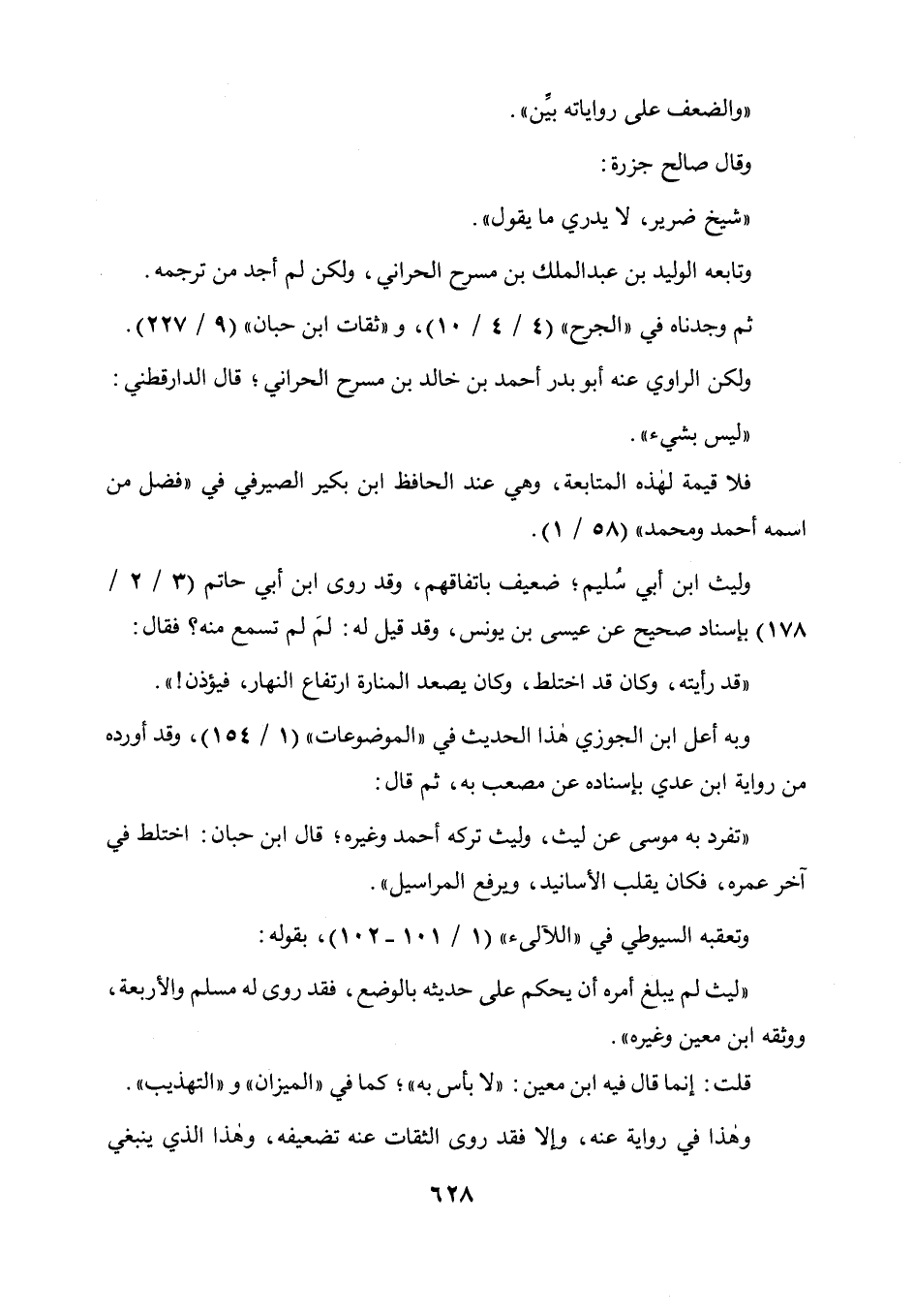 شيخ ضرير لا يدرى ما يقول، وتابعه الوليد بن عبد الملك بن مسرح الحراني، ولكن لم أجد من ترجمه، ثم وجدناه في الجرح (4 / 4 / 10) وثقات ابن حبان (9 / 227) ولكن الراوي عنه أبو بدر أحمد بن خالد بن مسرح الحراني.