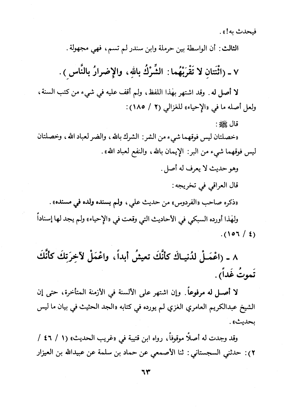 وإن اشتهر على الألسنة في الأزمنة المتأخرة حتى إن الشيخ عبد الكريم العامري الغزي لم يورده في كتابه " الجد الحثيث في بيان ما ليس بحديث ".
