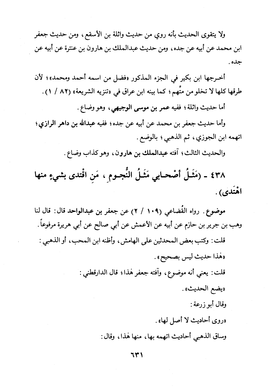 438 - " مثل أصحابي مثل النجوم من اقتدى بشيء منها اهتدى ".