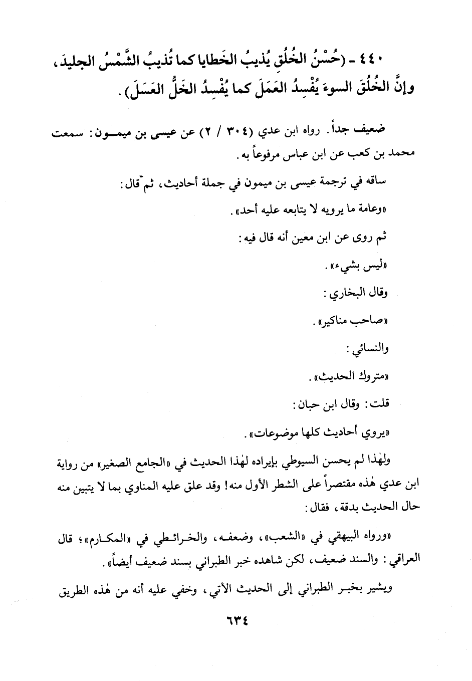 قلت: وقال ابن حبان: يروي أحاديث كلها موضوعات، ولهذا لم يحسن السيوطي بإيراده لهذا الحديث في " الجامع الصغير " من رواية ابن عدي هذه مقتصرا على الشطر الأول منه! وقد علق عليه المناوي بما لا يتبين منه حال الحديث بدقة فقال: ورواه البيهقي في " الشعب " وضعفه، والخرائطى في " المكارم "، قال العراقي: والسند ضعيف، لكن شاهده خبر الطبراني بسند ضعيف أيضا، ويشير بخبر الطبراني إلى الحديث الآتي، وخفي عليه أنه من هذه الطريق