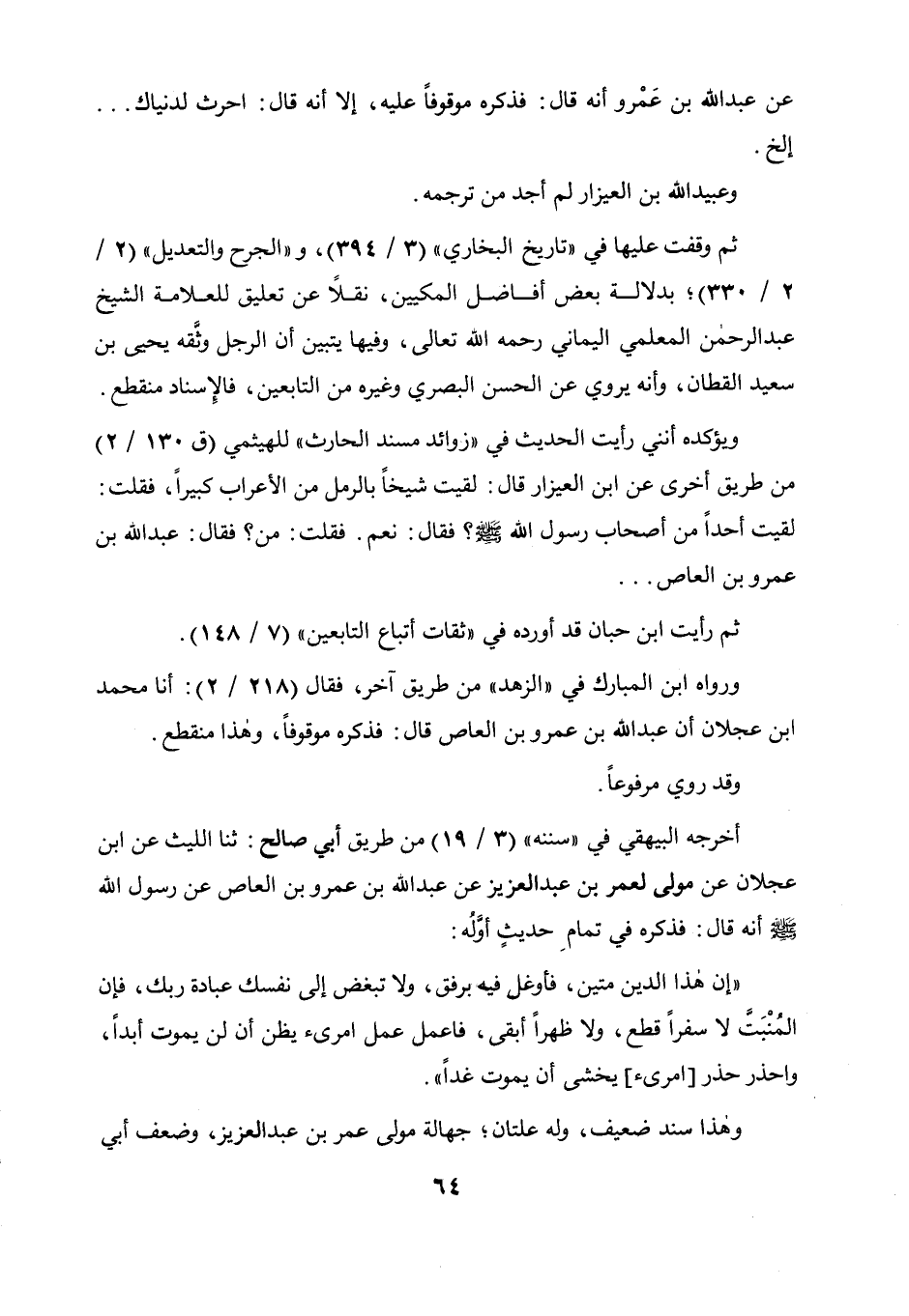 ويؤكده أنني رأيت الحديث في " زوائد مسند الحارث " للهيثمي (ق 130 / 2) من طريق أخرى عن ابن العيزار قال: لقيت شيخا بالرمل من الأعراب كبيرا فقلت: لقيت أحدا من أصحاب رسول الله صلى الله عليه وسلم؟ فقال: نعم، فقلت: من؟ فقال: عبد الله بن عمرو بن العاص....