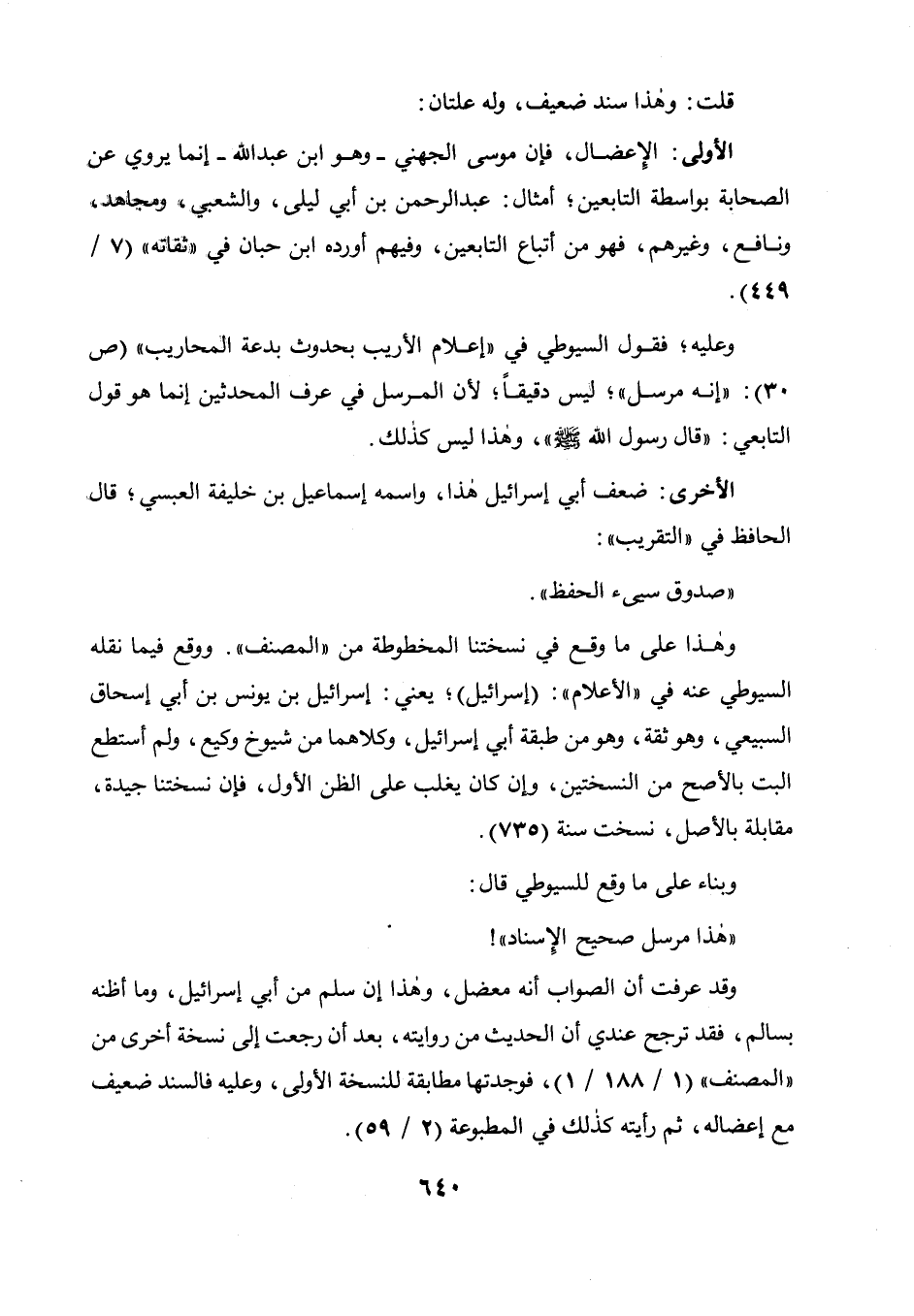 الأولى: الإعضال، فإن موسى الجهني وهو ابن عبد الله إنما يروي عن الصحابة بواسطة التابعين، أمثال عبد الرحمن بن أبي ليلى، والشعبي، ومجاهد، ونافع، وغيرهم، فهو من أتباع التابعين، وفيهم أورده ابن حبان في " ثقاته " (7 / 449) ، وعليه فقول السيوطي في " إعلام الأريب بحدوث بدعة المحاريب " (ص 30) إنه مرسل، ليس دقيقا، لأن المرسل في عرف المحدثين إنما هو قول التابعي: