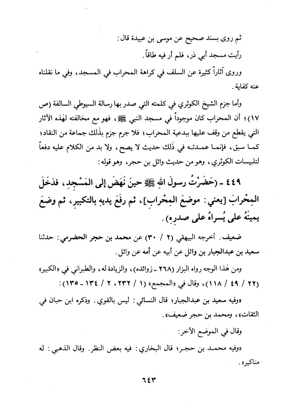 وأما جزم الشيخ الكوثري في كلمته التي صدر بها رسالة السيوطي السالفة (ص 17) : أن المحراب كان موجودا في مسجد النبي صلى الله عليه وسلم، فهو مع مخالفته لهذه الآثار التي يقطع من وقف عليها ببدعية المحراب، فلا جرم جزم بذلك جماعة من النقاد، كما سبق، فإنما عمدته في ذلك حديث لا يصح، ولا بد من الكلام عليه دفعا لتلبيسات الكوثري، وهو من حديث وائل بن حجر، وهو قوله: