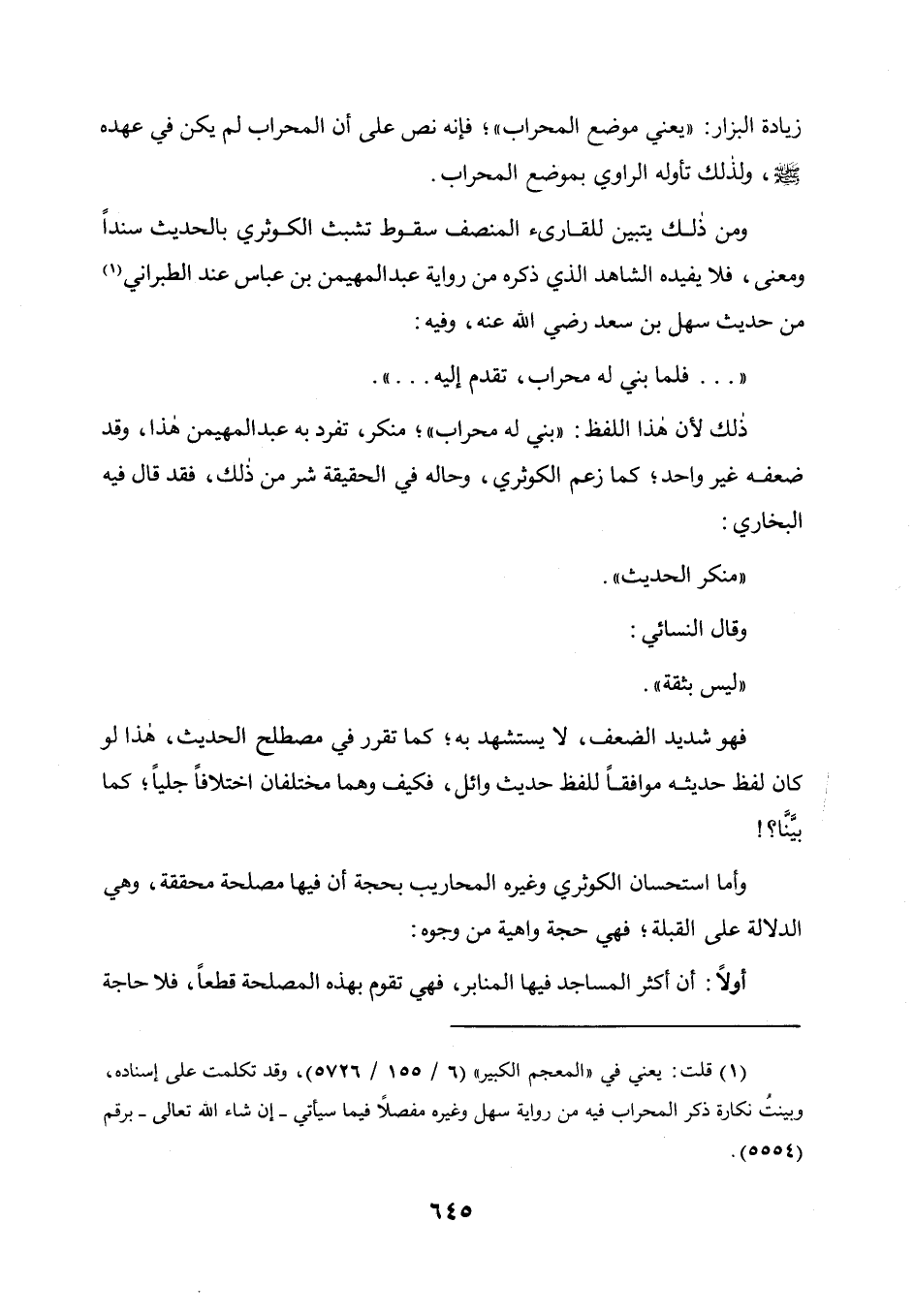 وأما استحسان الكوثرى وغيره المحاريب، بحجة أن فيها مصلحة محققة، وهي الدلالة على القبلة، فهي حجة واهية من وجوه: