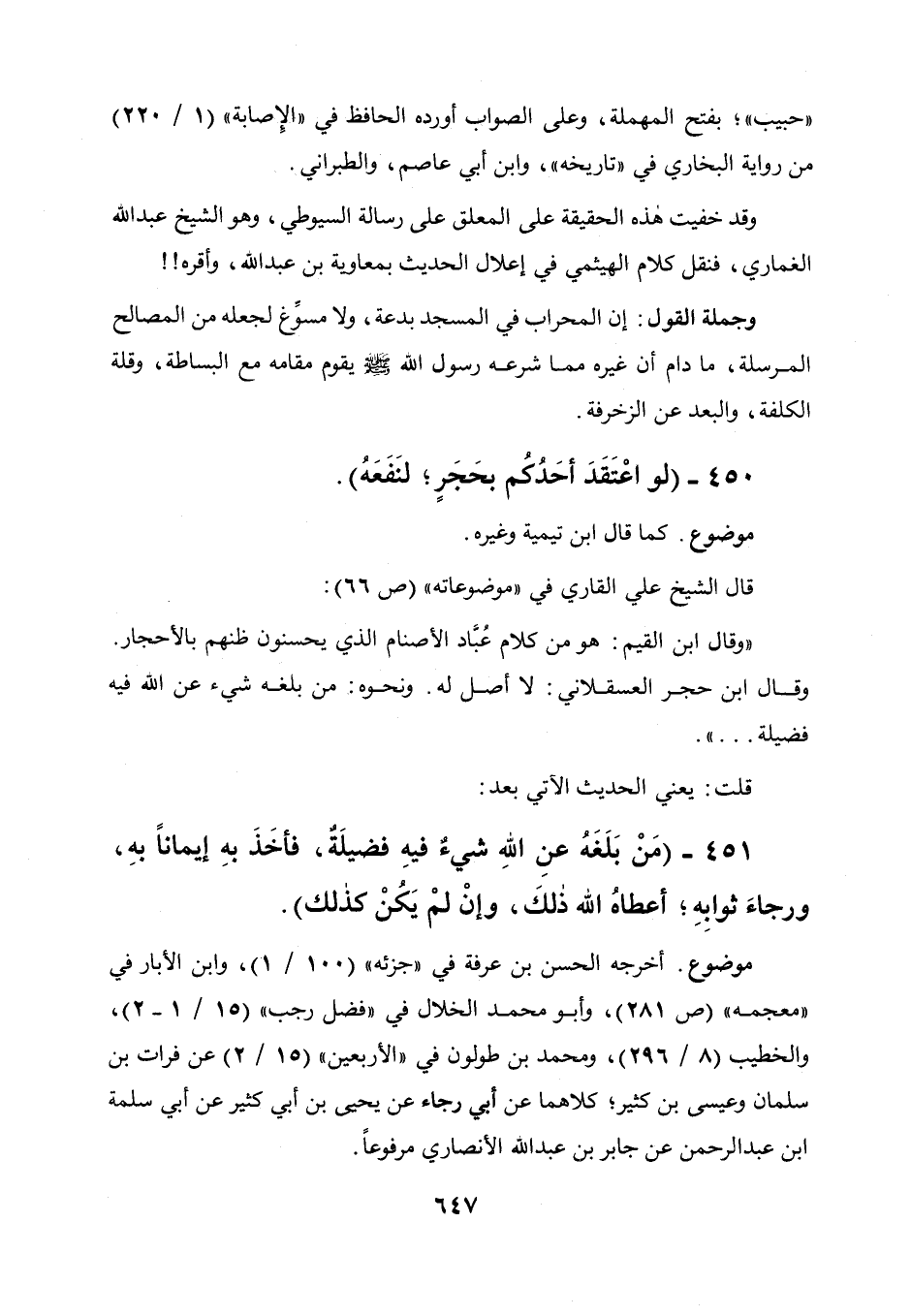 451 - " من بلغه عن الله شيء فيه فضيلة فأخذ به إيمانا به ورجاء ثوابه أعطاه الله ذلك وإن لم يكن كذلك ".