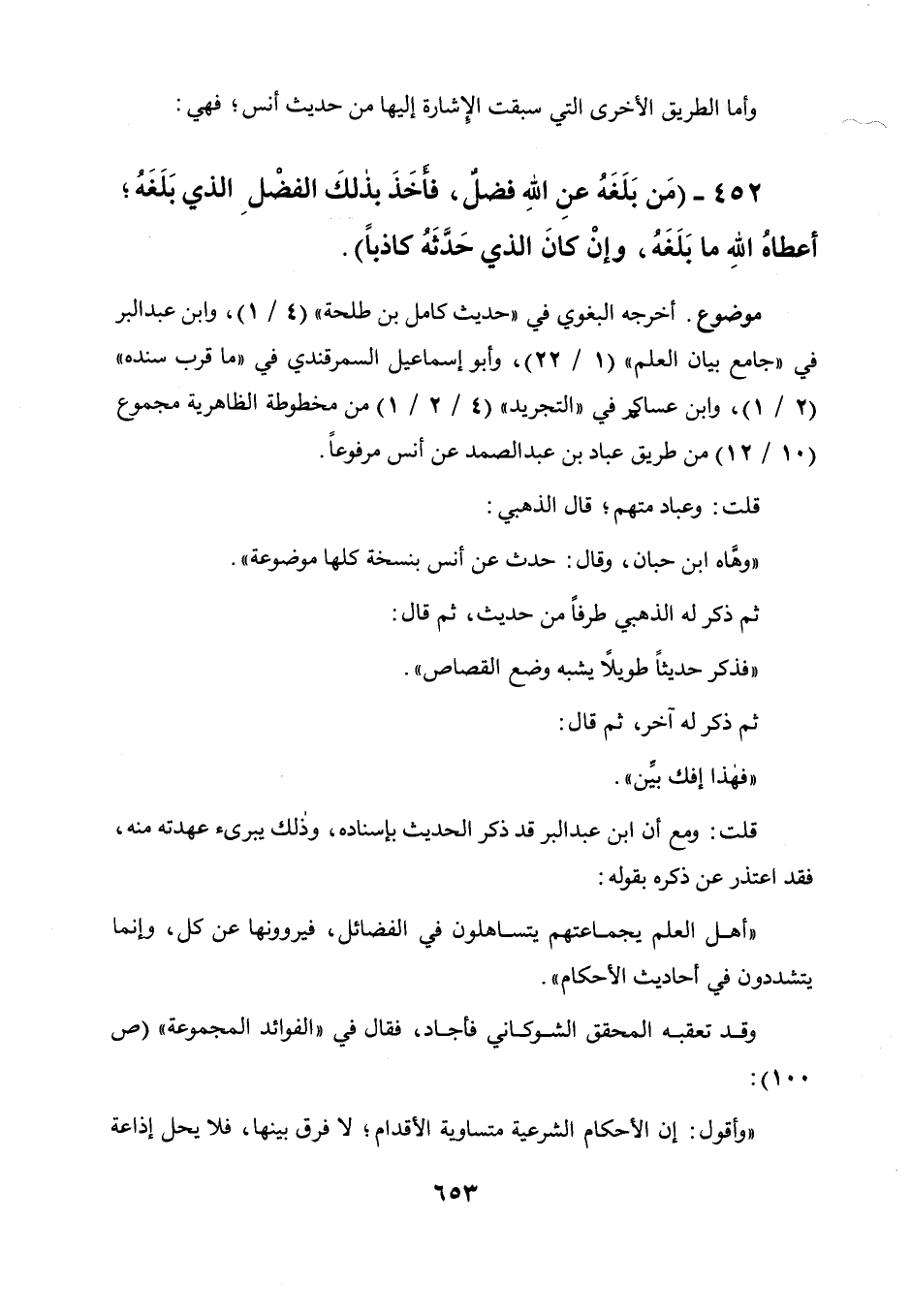 452 - " من بلغه عن الله فضل فأخذ بذلك الفضل الذي بلغه، أعطاه الله ما بلغه وإن كان الذي حدثه كاذبا ".