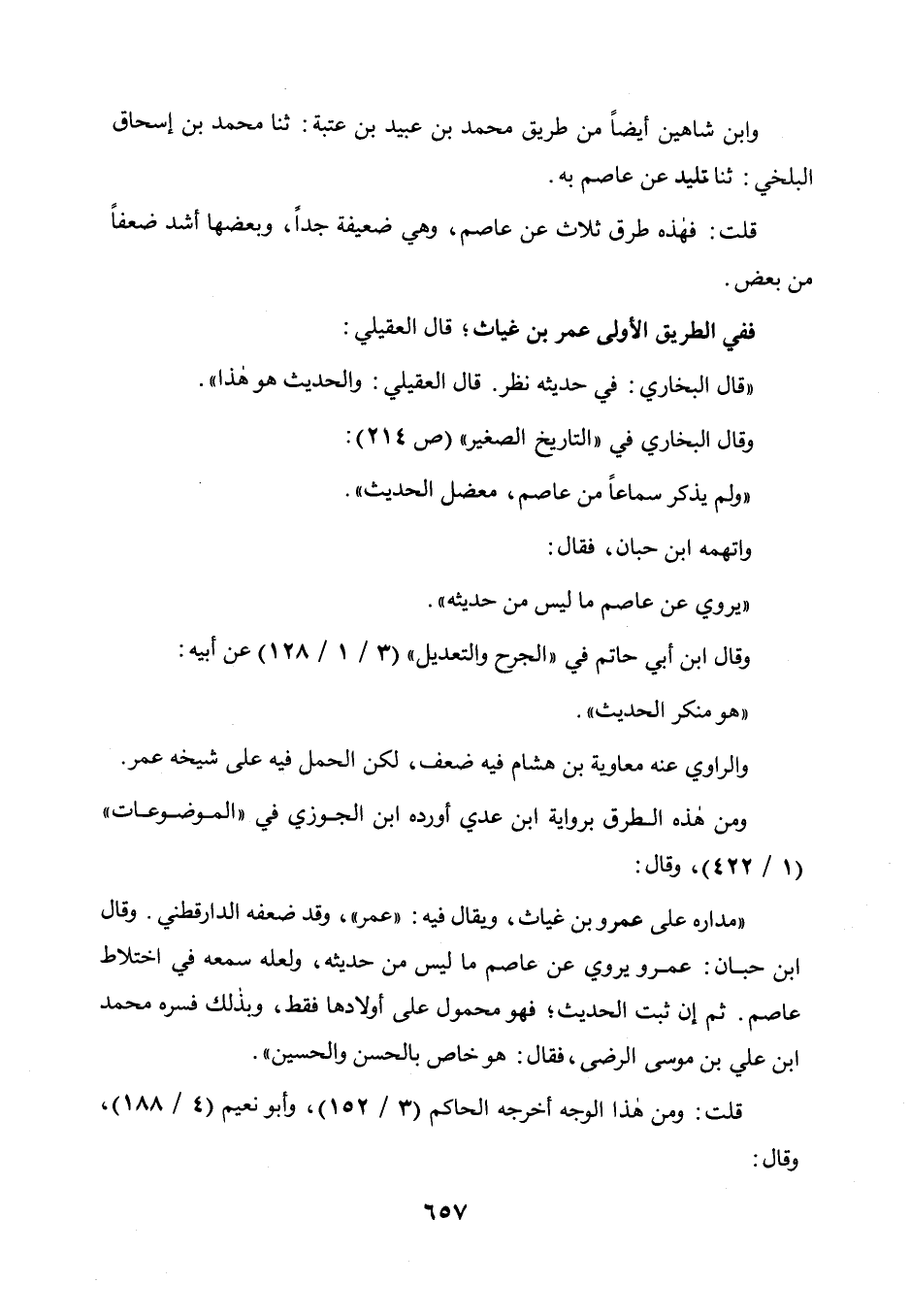 ولم يذكر سماعا من عاصم، معضل الحديث، واتهمه ابن حبان فقال: يروي عن عاصم ما ليس من حديثه، وقال ابن أبي حاتم في " الجرح والتعديل " (3 / 1 / 128) عن أبيه: هو منكر الحديث، والراوي عنه معاوية بن هشام فيه ضعف، لكن الحمل فيه على شيخه عمر، ومن هذه الطرق برواية ابن عدي أورده ابن الجوزي في " الموضوعات " وقال: مداره على عمرو بن غياث ويقال فيه عمر، وقد ضعفه الدارقطني، وقال ابن حبان: عمرو يروي عن عاصم ما ليس من حديثه، ولعله سمعه في اختلاط عاصم، ثم إن ثبت الحديث فهو محمول على أولادها فقط، وبذلك فسره