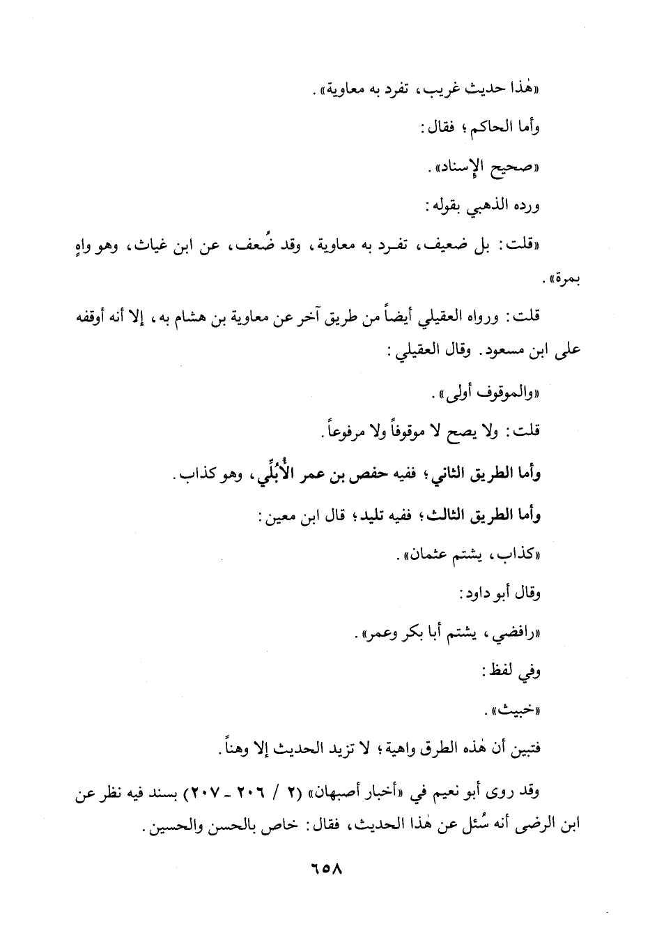 قلت: ورواه العقيلي أيضا من طريق آخر عن معاوية بن هشام به، إلا أنه أوقفه على ابن مسعود، وقال العقيلي: والموقوف أولى.