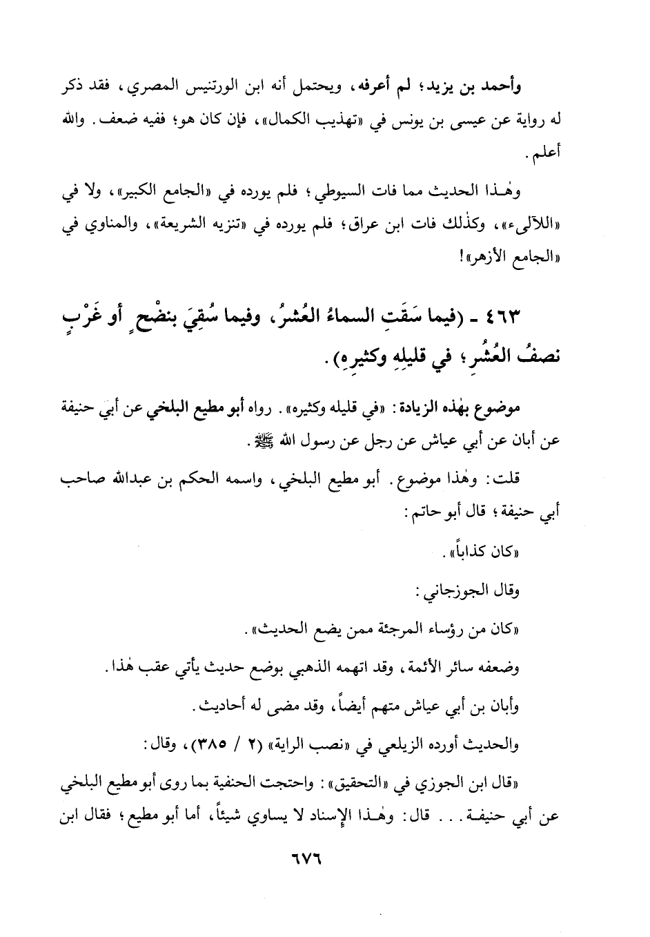 463 - " فيما سقت السماء العشر، وفيما سقي بنضح أو غرب نصف العشر في قليله وكثيره ".