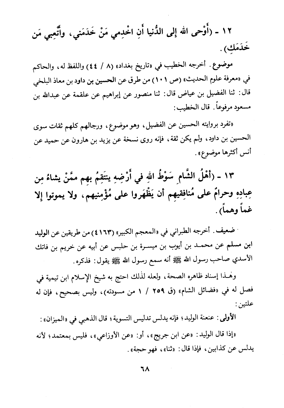 وهذا إسناد ظاهره الصحة ولعله لذلك احتج به شيخ الإسلام ابن تيمية في فصل له في " فضائل الشام " (ق 259 / 1 من مسودته) وليس بصحيح فإن له علتين: الأولى: عنعنعة الوليد فإنه يدلس تدليس التسوية، قال الذهبي في " الميزان ": " إذا قال الوليد: عن ابن جريج أو عن الأو زاعى فليس بمعتمد لأنه يدلس عن كذابين فإذا قال: " ثنا " فهو حجة "