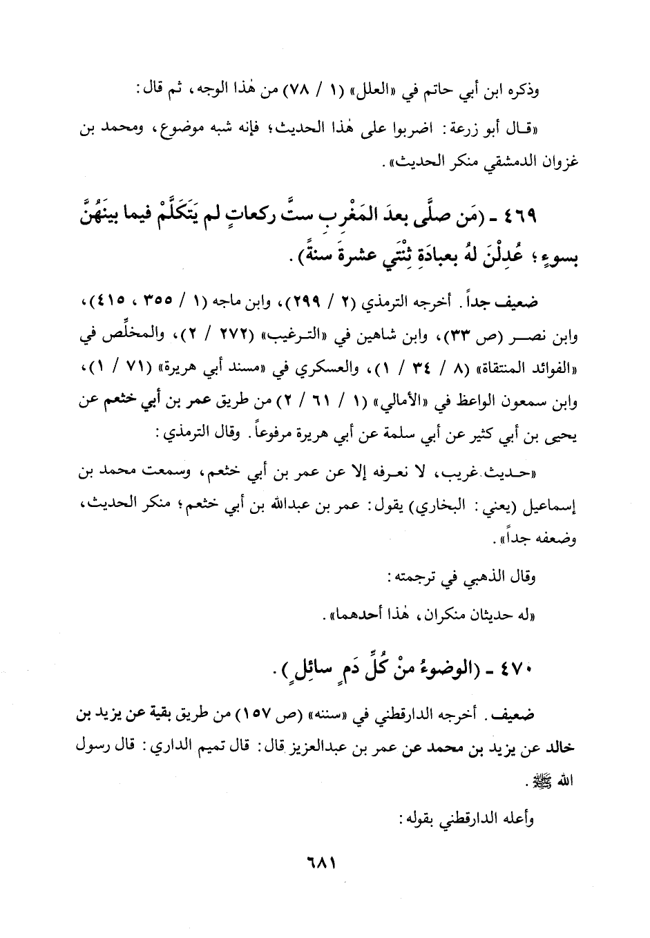 أخرجه الترمذي (2 / 299) وابن ماجه (1 / 355، 415) وابن نصر (ص 33) وابن شاهين في " الترغيب " (272 / 2) والمخلص في " الفوائد المنتقاة " (8 / 34 / 1) والعسكري في " مسند أبي هريرة " (71 / 1) وابن سمعون الواعظ في " الأمالي " (1 / 61 / 2) من طريق عمر بن أبي خثعم عن يحيى بن أبي كثير عن أبي سلمة عن أبي هريرة مرفوعا، وقال الترمذي: حديث غريب لا نعرفه إلا عن عمر بن أبي خثعم، وسمعت محمد بن إسماعيل (يعني البخاري) يقول: عمر بن عبد الله بن أبي خثعم منكر الحديث، وضعفه جدا، وقال الذهبي في ترجمته: له حديثان منكران هذا أحدهما.