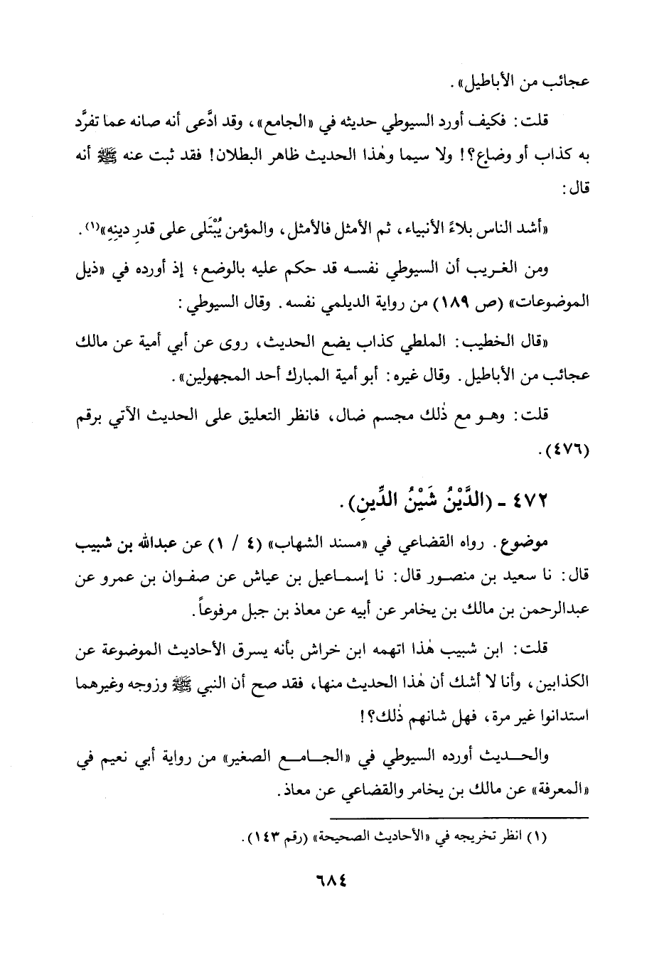 ومن الغريب أن السيوطي نفسه قد حكم عليه بالوضع، إذ أورده في " ذيل الموضوعات " (ص 189) من رواية الديلمي نفسه وقال السيوطي: قال الخطيب: الملطي كذاب يضع الحديث روى عن أبي أمية عن مالك عجائب من الأباطيل، وقال غيره: أبو أمية المبارك أحد المجهولين.