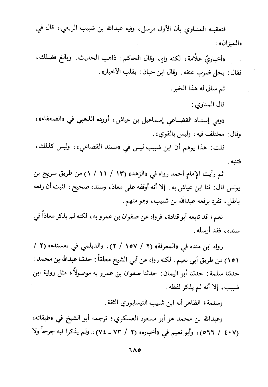 فتعقبه المناوي بأن الأول مرسل، وفيه عبد الله بن شبيب الربعي، قال في " الميزان ": أخباري علامة، لكنه واه، وقال الحاكم: ذاهب الحديث، وبالغ فضلك فقال: يحل ضرب عنقه، وقال ابن حبان: يقلب الأخبار، ثم ساق له هذا الخبر، قال المناوي: وفي إسناد القضاعي إسماعيل بن عياش أورده الذهبي في " الضعفاء " وقال: مختلف فيه وليس بالقوي.