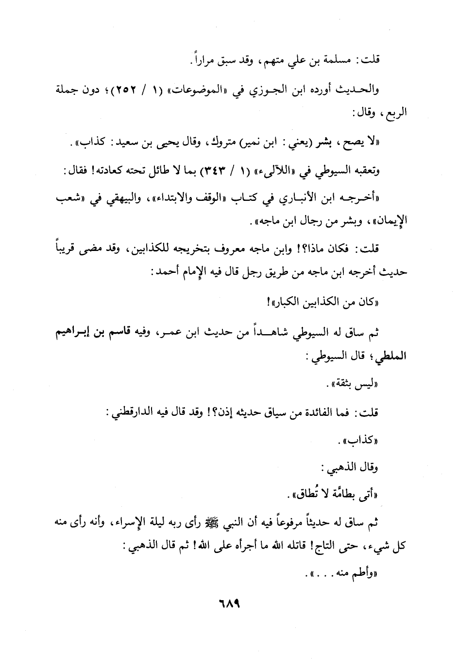 قلت: فما الفائدة من سياق حديثه إذن؟ وقد قال فيه الدارقطني: كذاب، وقال الذهبي: أتى بطامة لا تطاق، ثم ساق له حديثا مرفوعا فيه أن النبي صلى الله عليه وسلم رآى ربه ليلة الإسراء، وأنه رأى منه كل شيء حتى التاج قاتله الله ما أجرأه على الله، ثم قال الذهبي: " وأطم منه. . . "