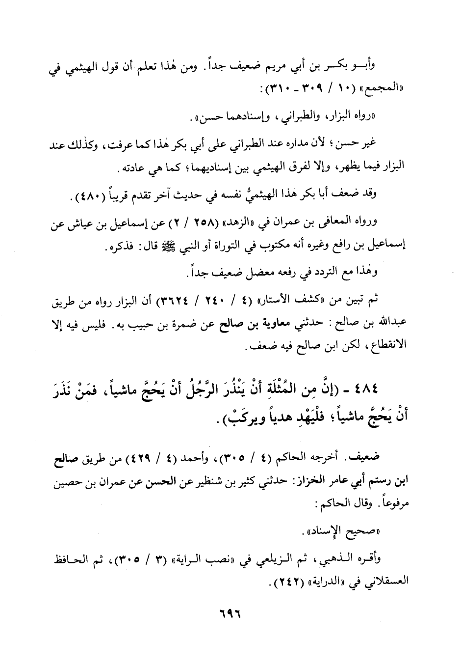 484 - " إن من المثلة أن ينذر الرجل أن يحج ماشيا، فمن نذر أن يحج ماشيا فليهد هديا ويركب ".