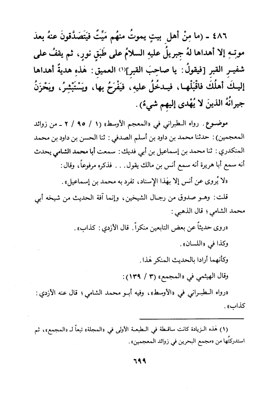 486 - " ما من أهل بيت يموت منهم ميت فيتصدقون عنه بعد موته إلا أهداها له جبريل عليه السلام على طبق نور، ثم يقف على شفير القبر فيقول: يا صاحب القبر العميق: هذه هدية أهداها إليك أهلك فاقبلها، فيدخل عليه فيفرح بها ويستبشر، ويحزن جيرانه الذين لا يهدى إليهم شيء ".